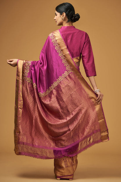 This peach silk saree is ideal for fashion-conscious individuals seeking a unique blend of traditional craftsmanship and modern style. Its soft peach color and intricate floral motif embroidery make it a perfect choice for wedding, sangeet, and engagement ceremonies, showcasing a perfect blend of elegance and sophistication. With its luxurious fabric and intricate embroidery, this saree is sure to turn heads at any special occasion.