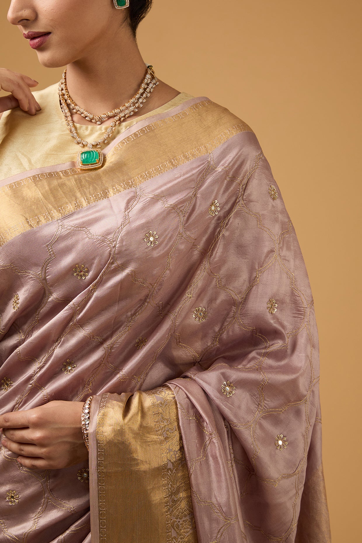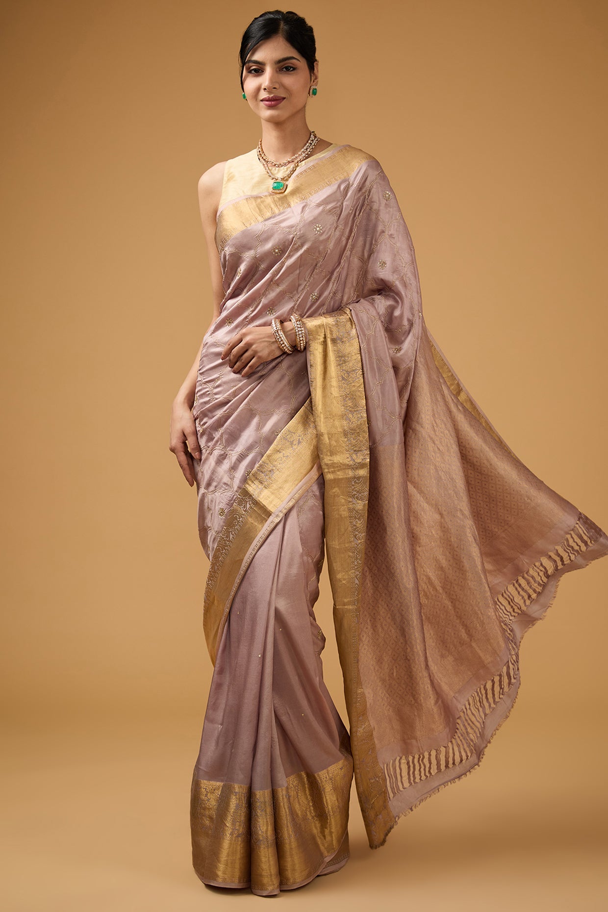 Featuring a pink plumish saree in silk base with gold border detail and sequins motif work. It is paired with a blouse. Accentuate it with statement jewellery and heels for a festive occasion.