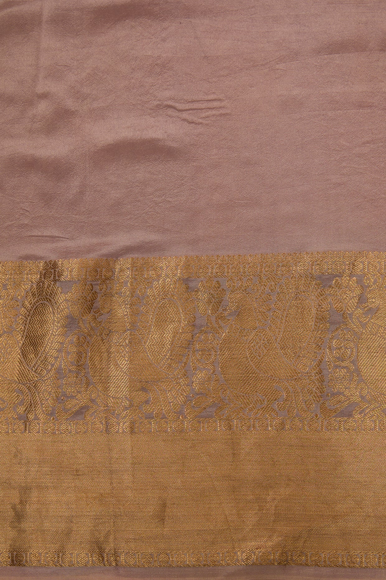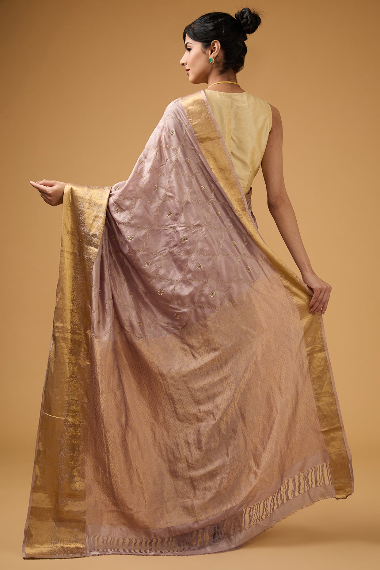 Paired with a matching blouse, this ensemble is perfect for special occasions. The silk base provides a smooth and lustrous finish, accentuating the gold border detail and sequins motif work. The pink plumish color is a unique and stylish choice, ideal for making a statement at festive events.