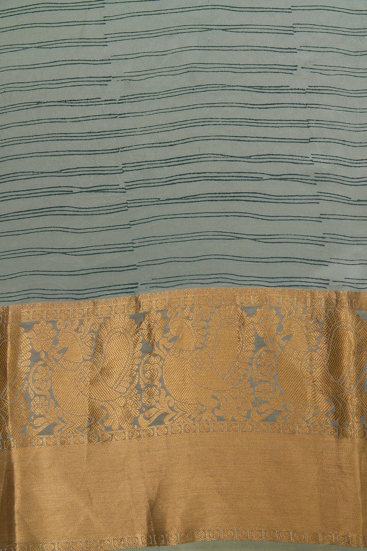 The bluish-grey saree is a masterpiece of traditional Indian craftsmanship, featuring a luxurious silk base that drapes elegantly on the body. The saree boasts a unique block print design, expertly crafted to add a touch of classic charm. A striking golden border detail adds a luxurious finish, making this saree perfect for festive events.