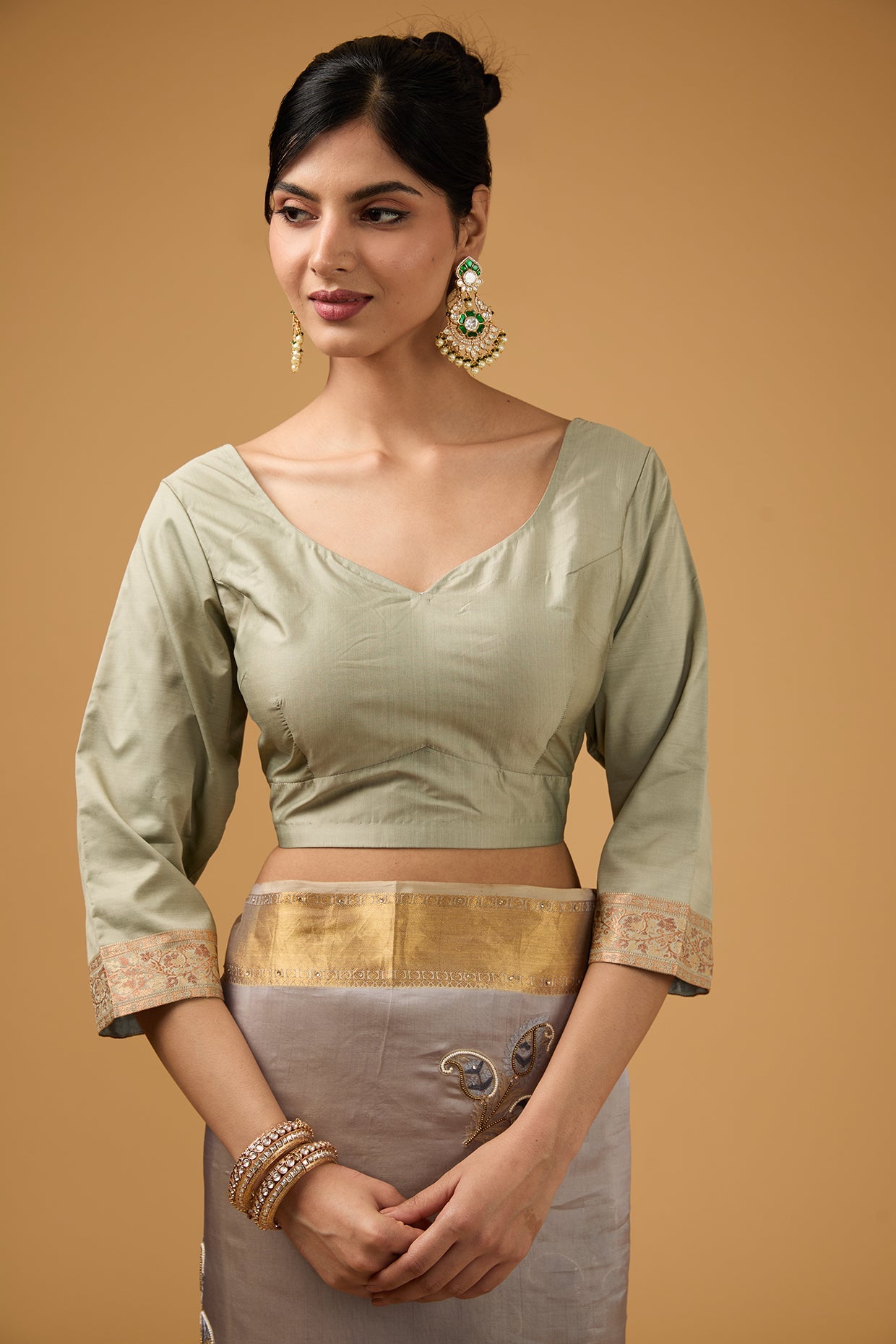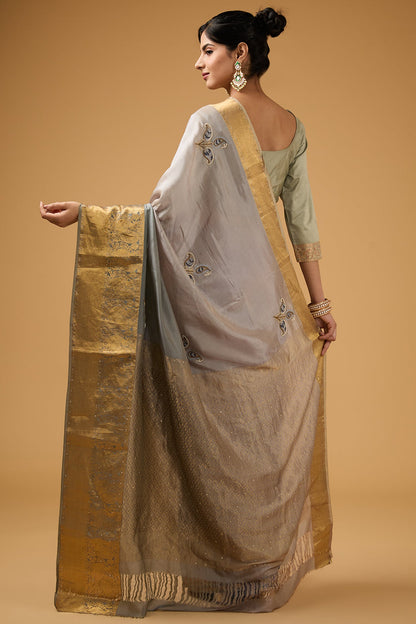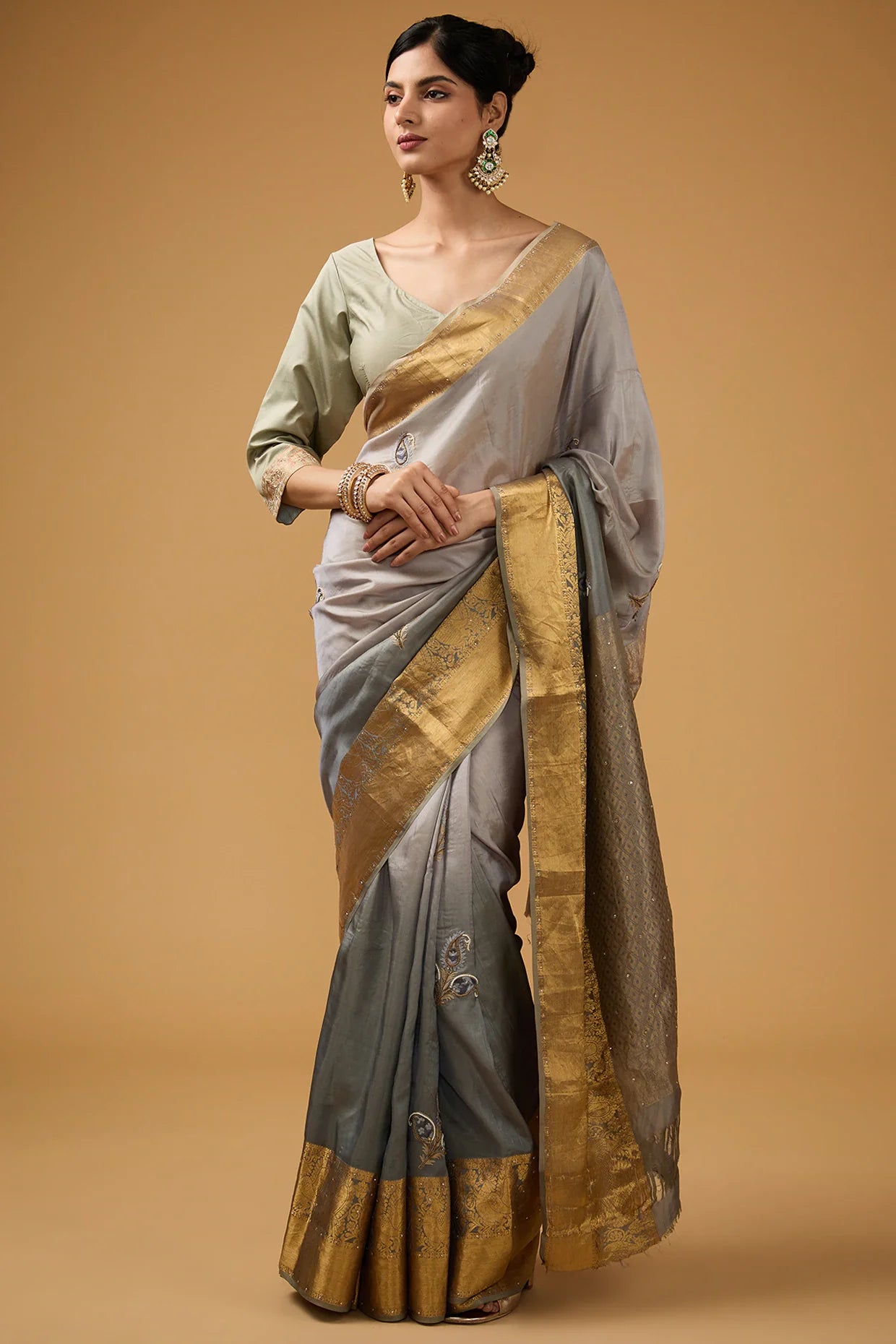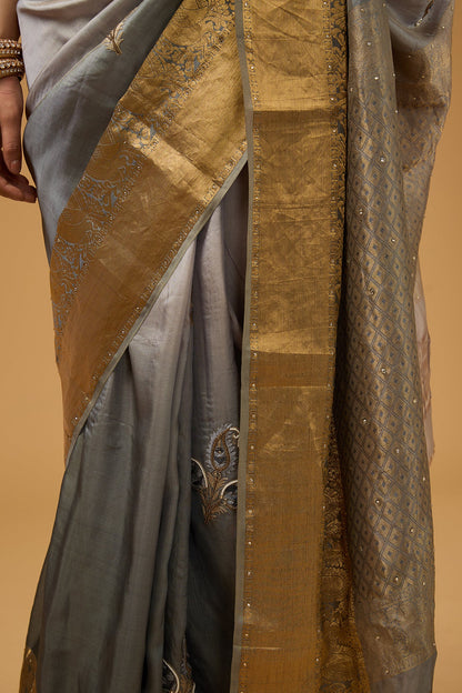 Featuring a grey saree in silk base with gold border detail and floral embroidery. It is paired with a blouse. Accentuate it with statement jewellery and heels for a festive occasion.
