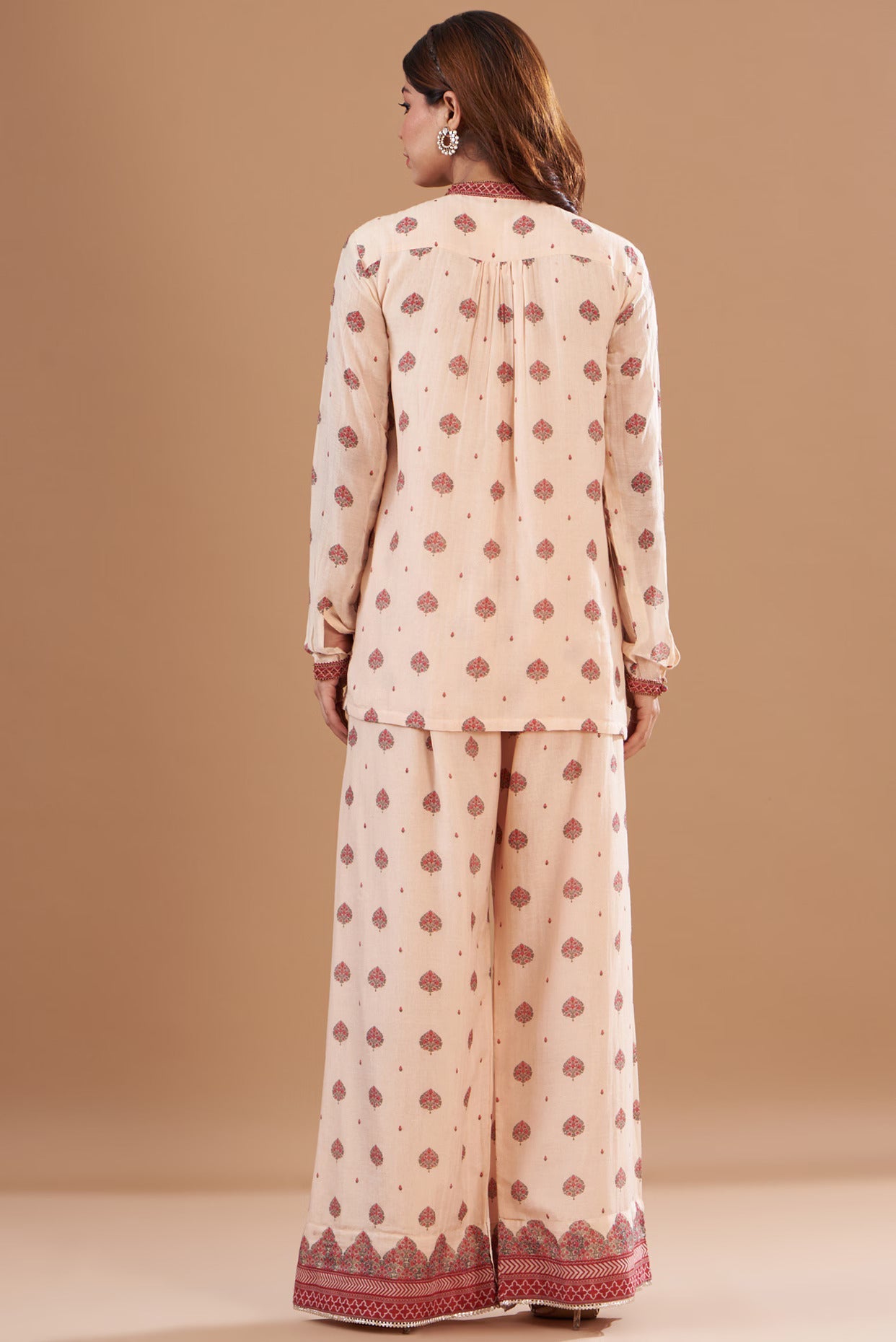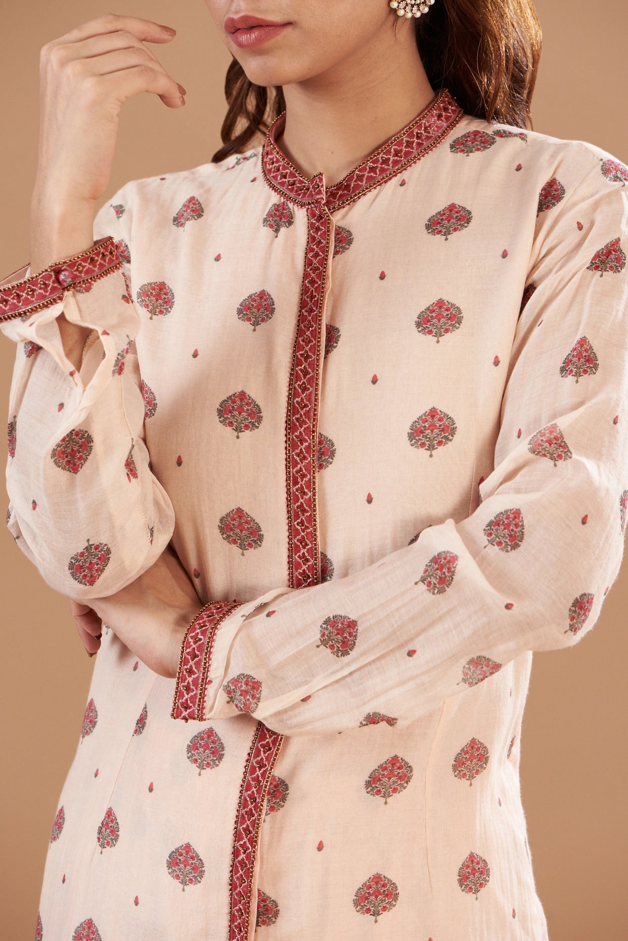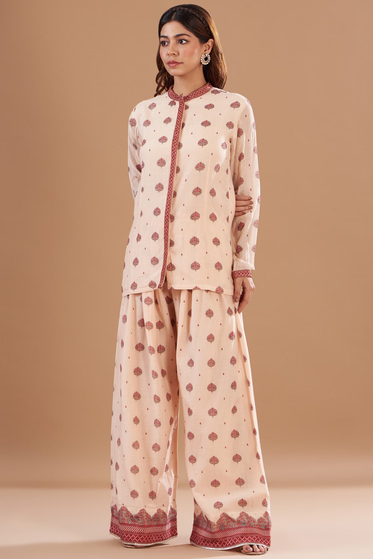 Beige coord set in chanderi base with hand embroidery and digital print.