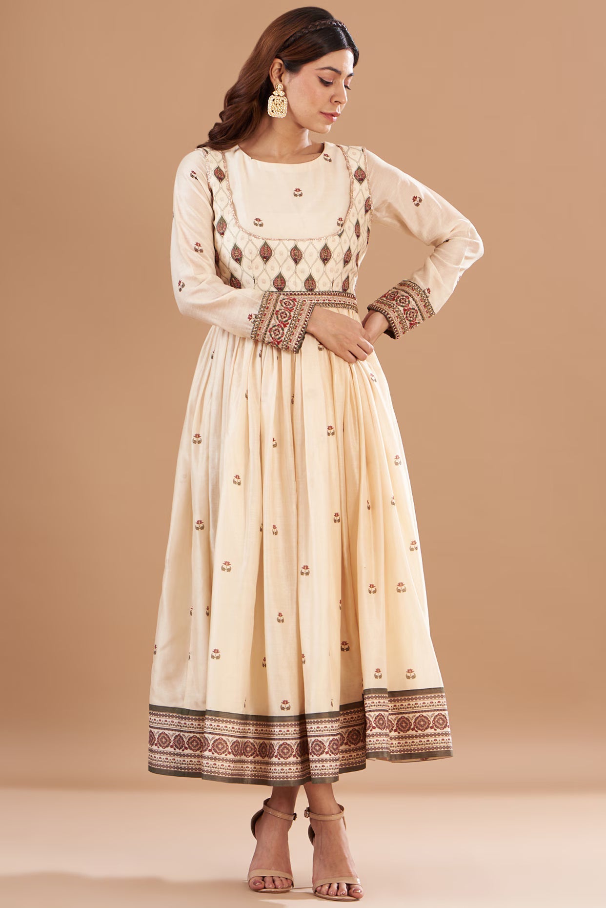 Featuring a beige gathered anarkali in chanderi base with digital print and hand embroidery.