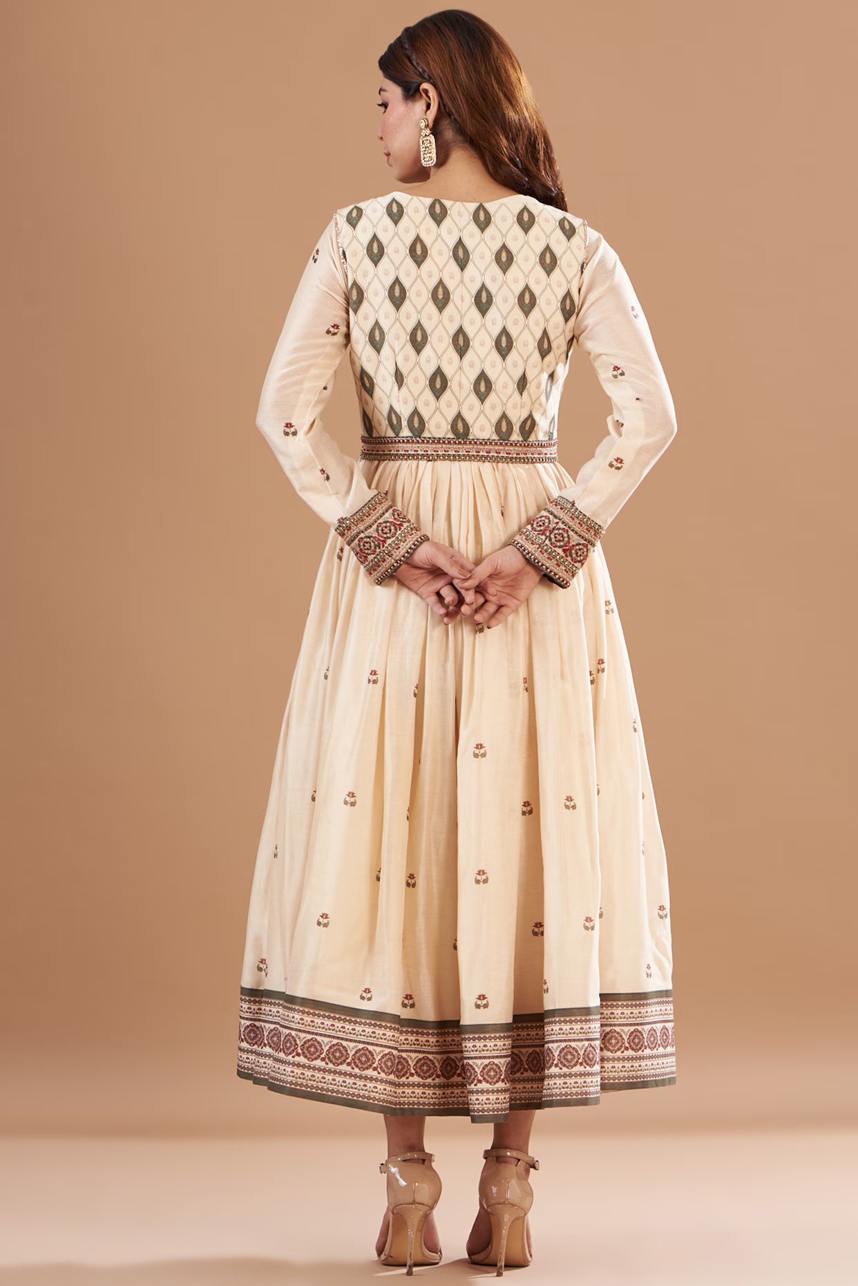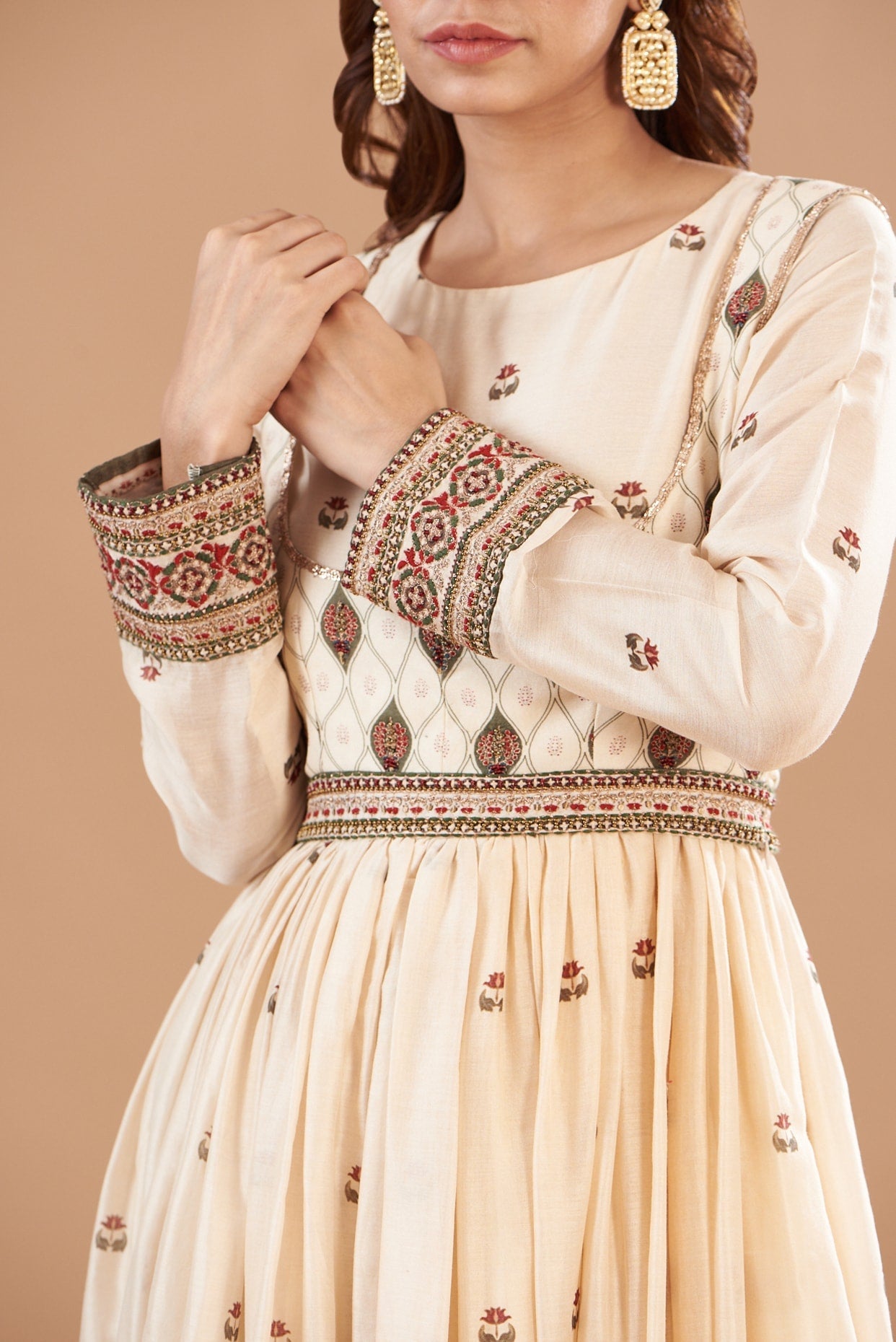 Beige Chanderi Printed & Embroidered Anarkali with fitted pants