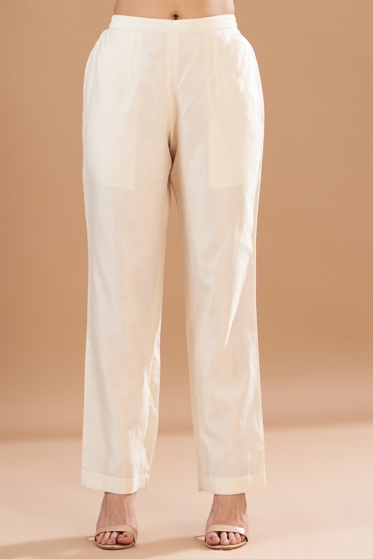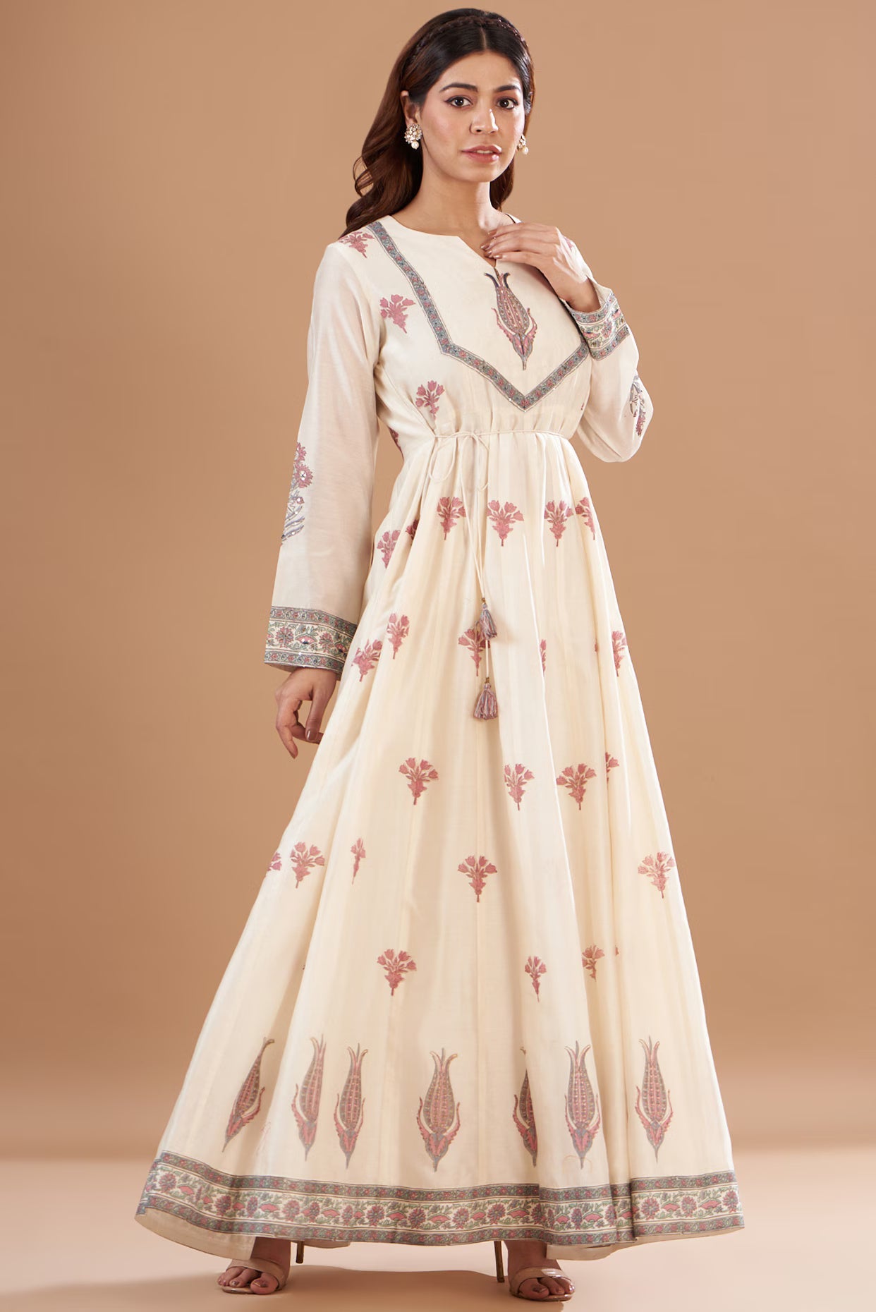 Featuring an ivory kalidar kurta in chanderi base with hand embroidery and block print.