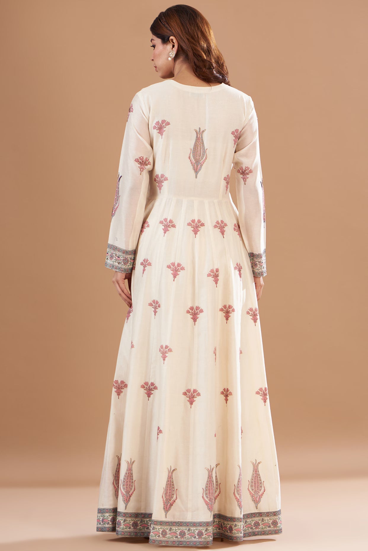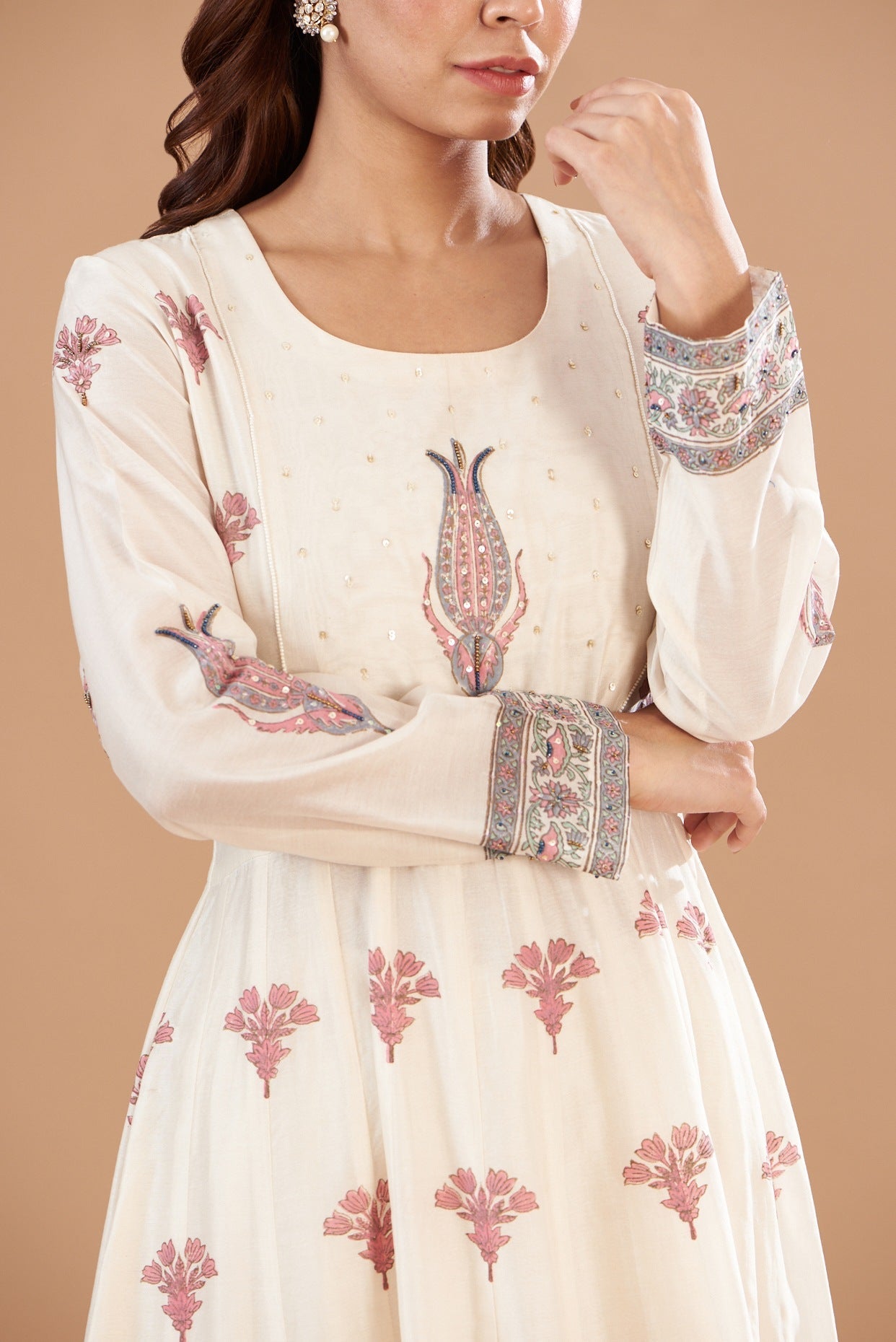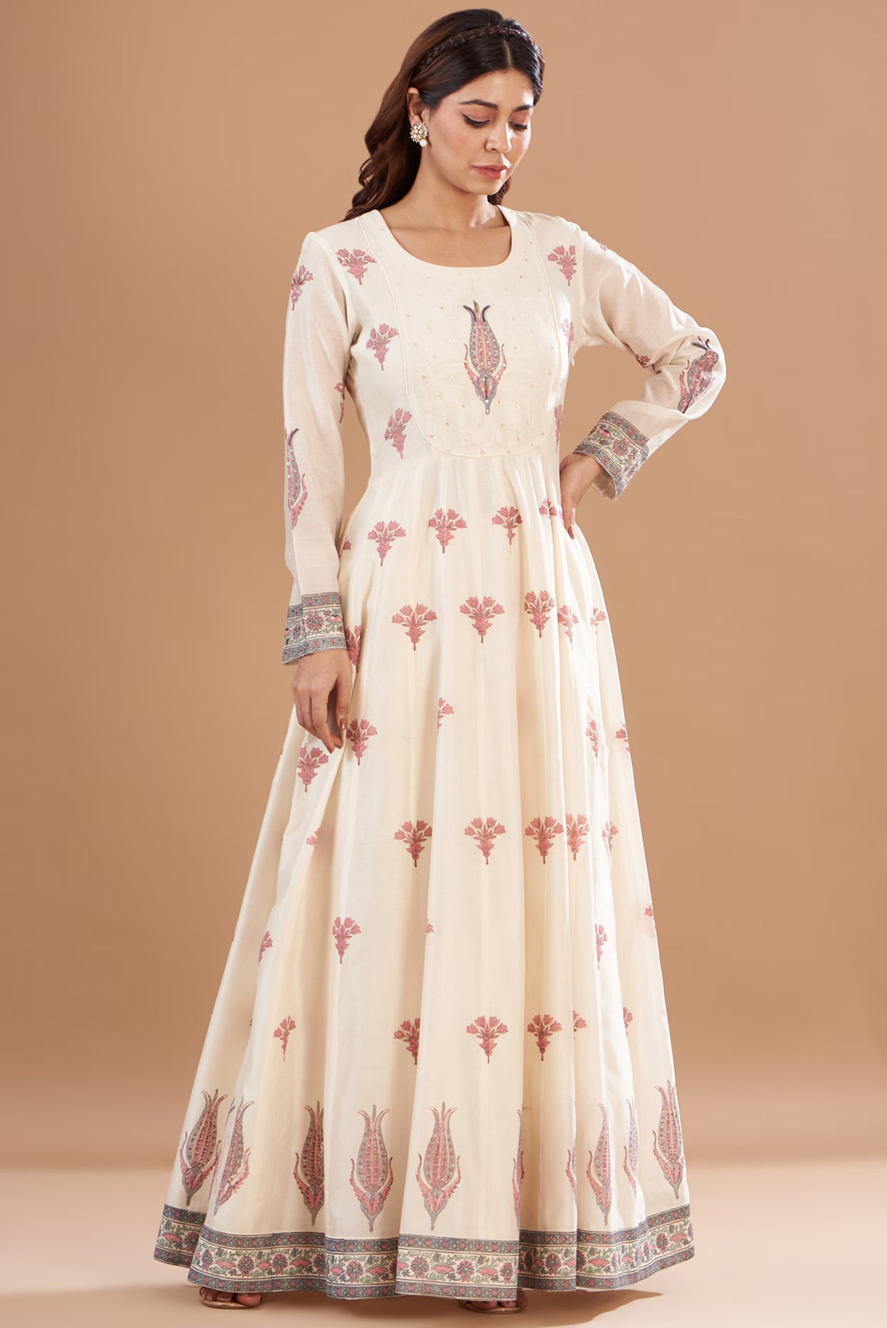 Featuring an ivory anarkali in chanderi base with hand embroidery and block print. It is paired with matching pants