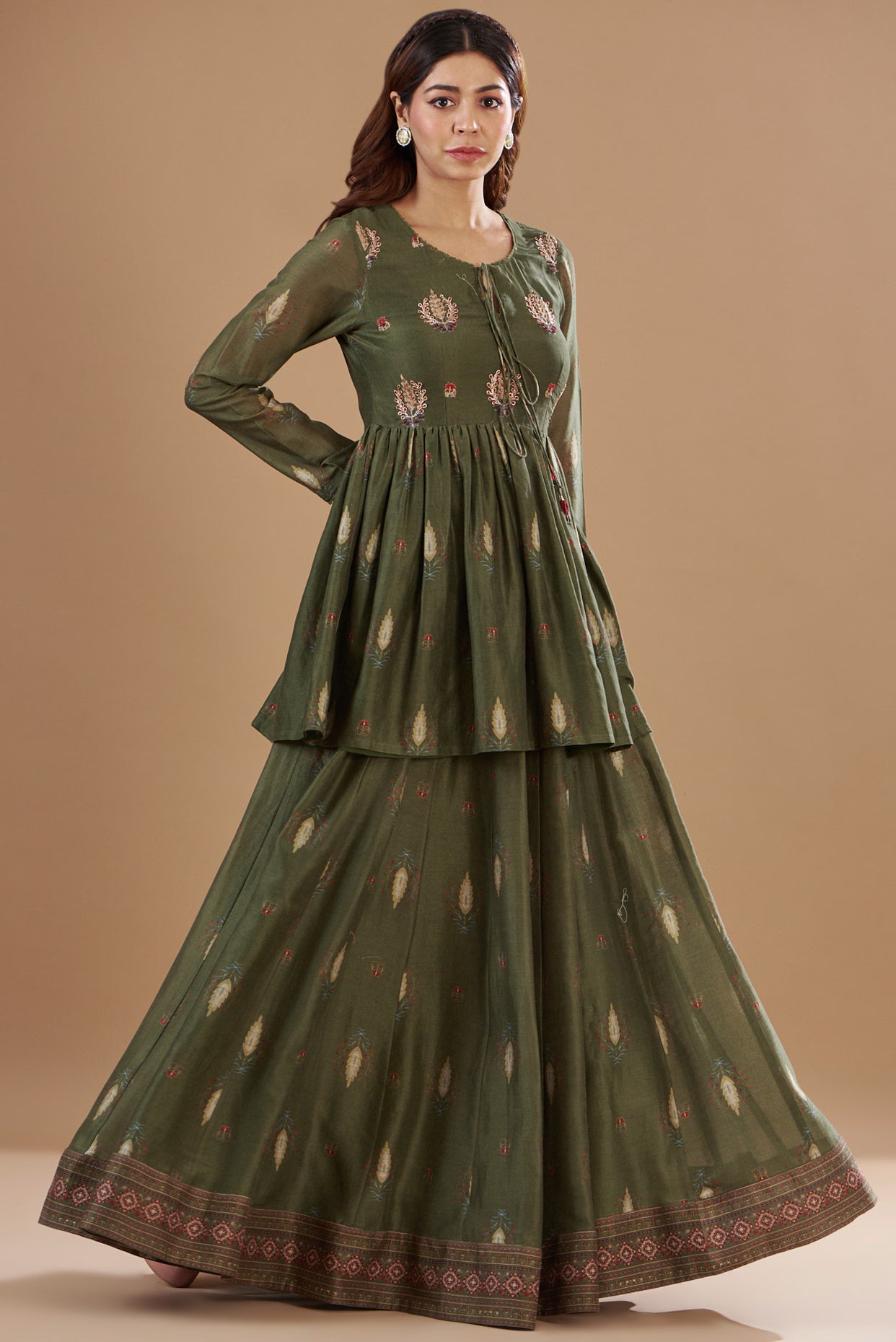Featuring a green lehenga in chanderi base with digital print and hand embroidery. It is paired with a matching short kurta.