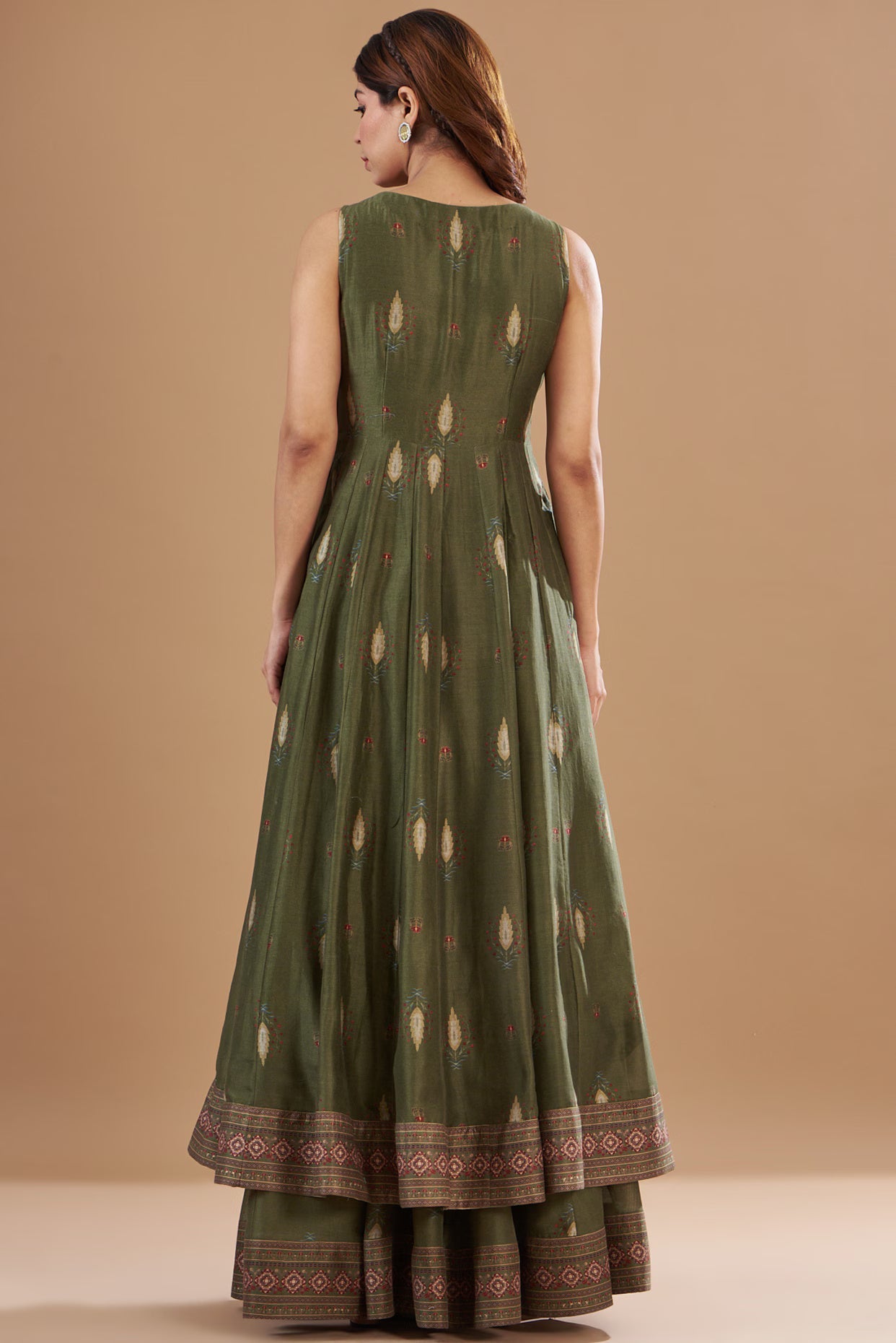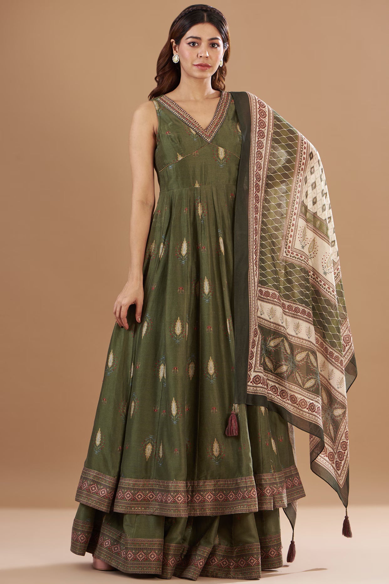 Featuring a green anarkali in chanderi base with digital print and hand embroidery. It is paired with a matching dupatta.