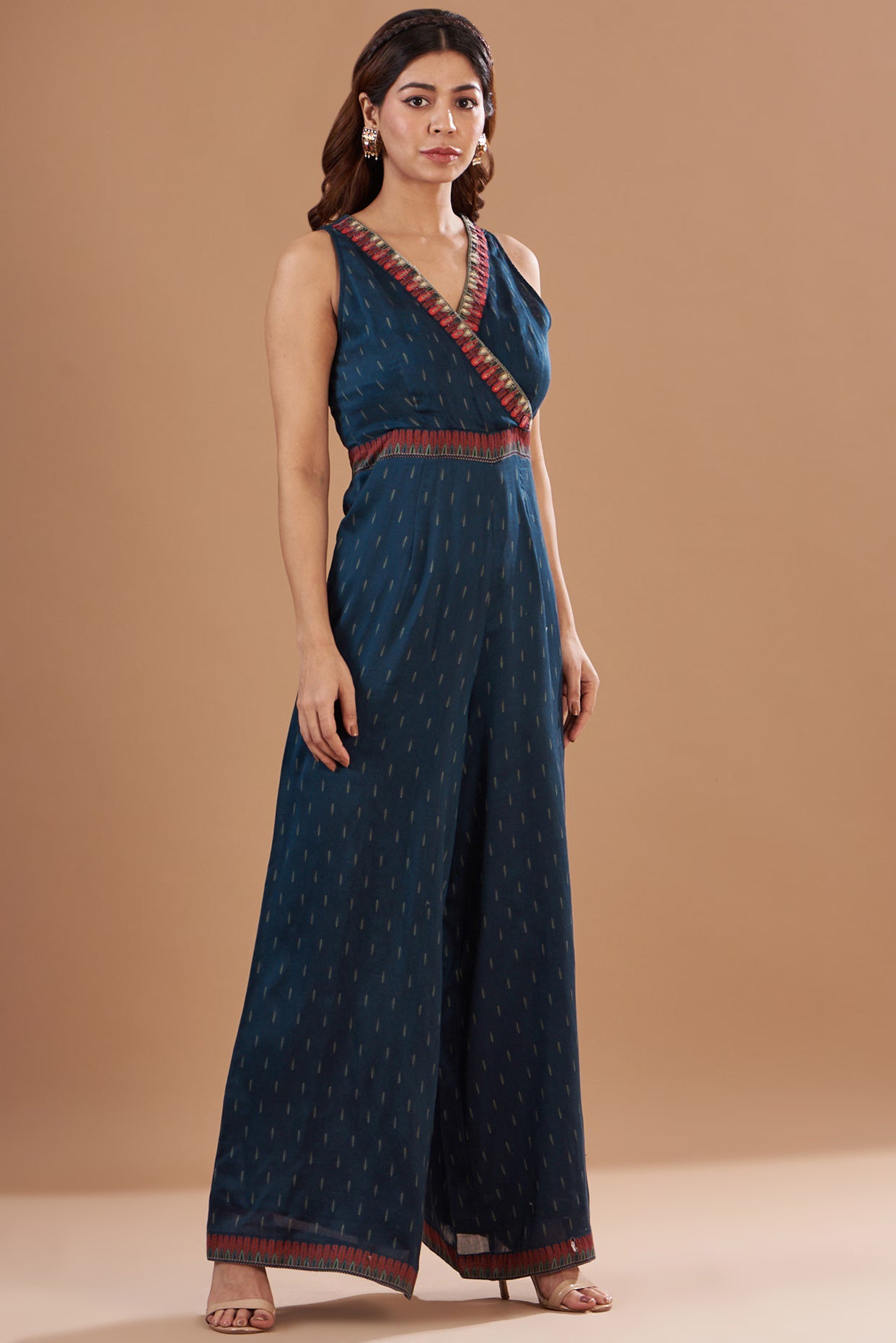 Blue Chanderi Printed & Embroidered Jumpsuit