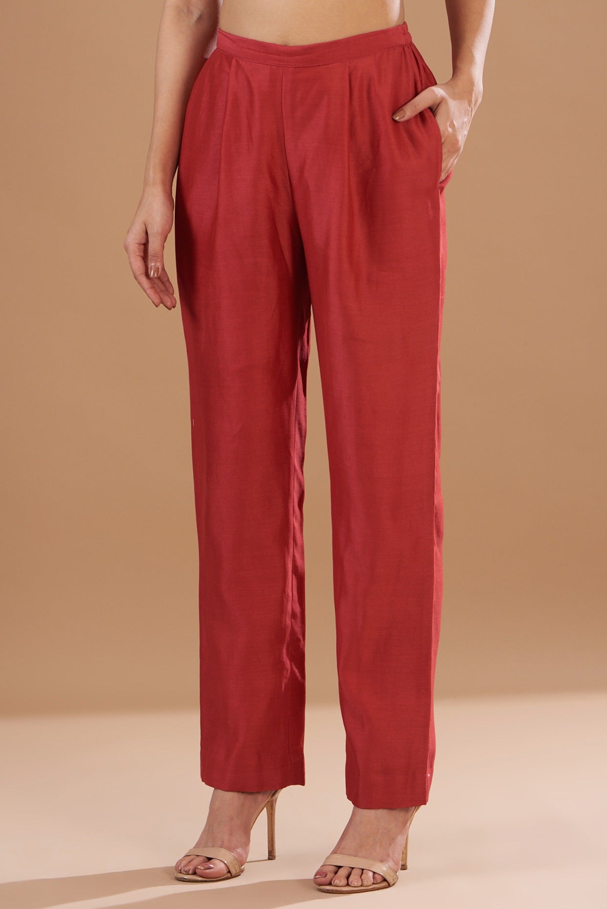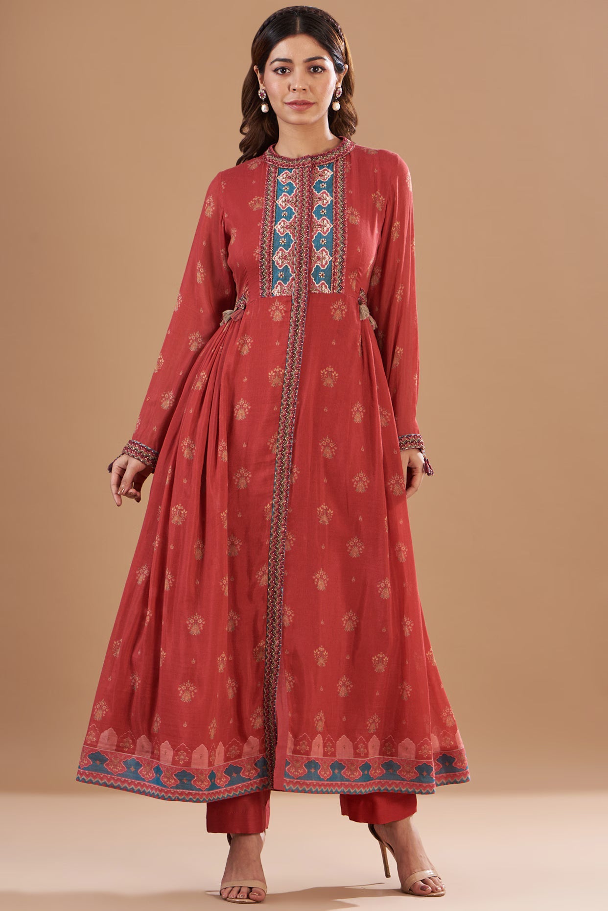 Featuring a red gathered kurta in chanderi base with digital print and hand embroidery. It is paired with a matching pants.