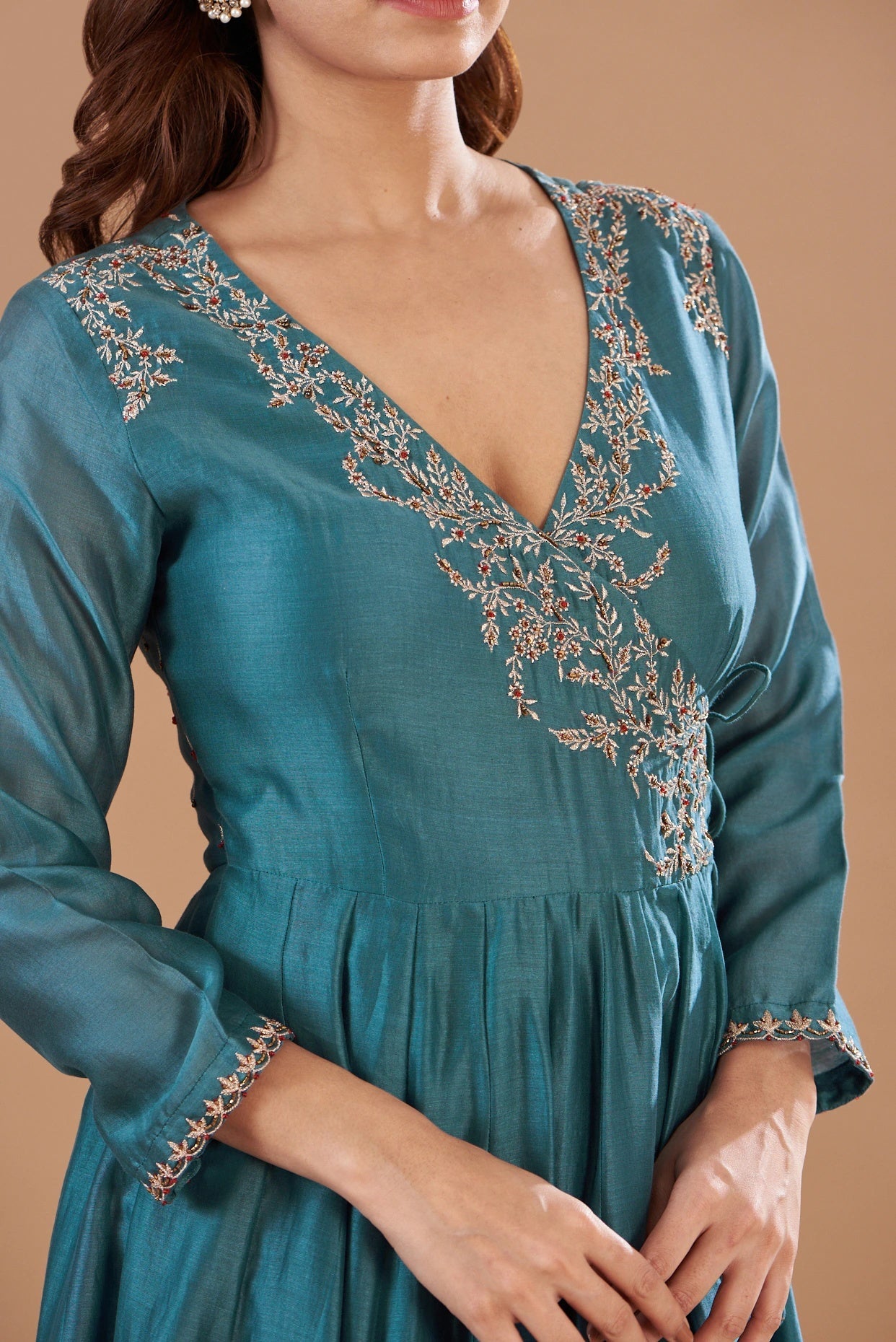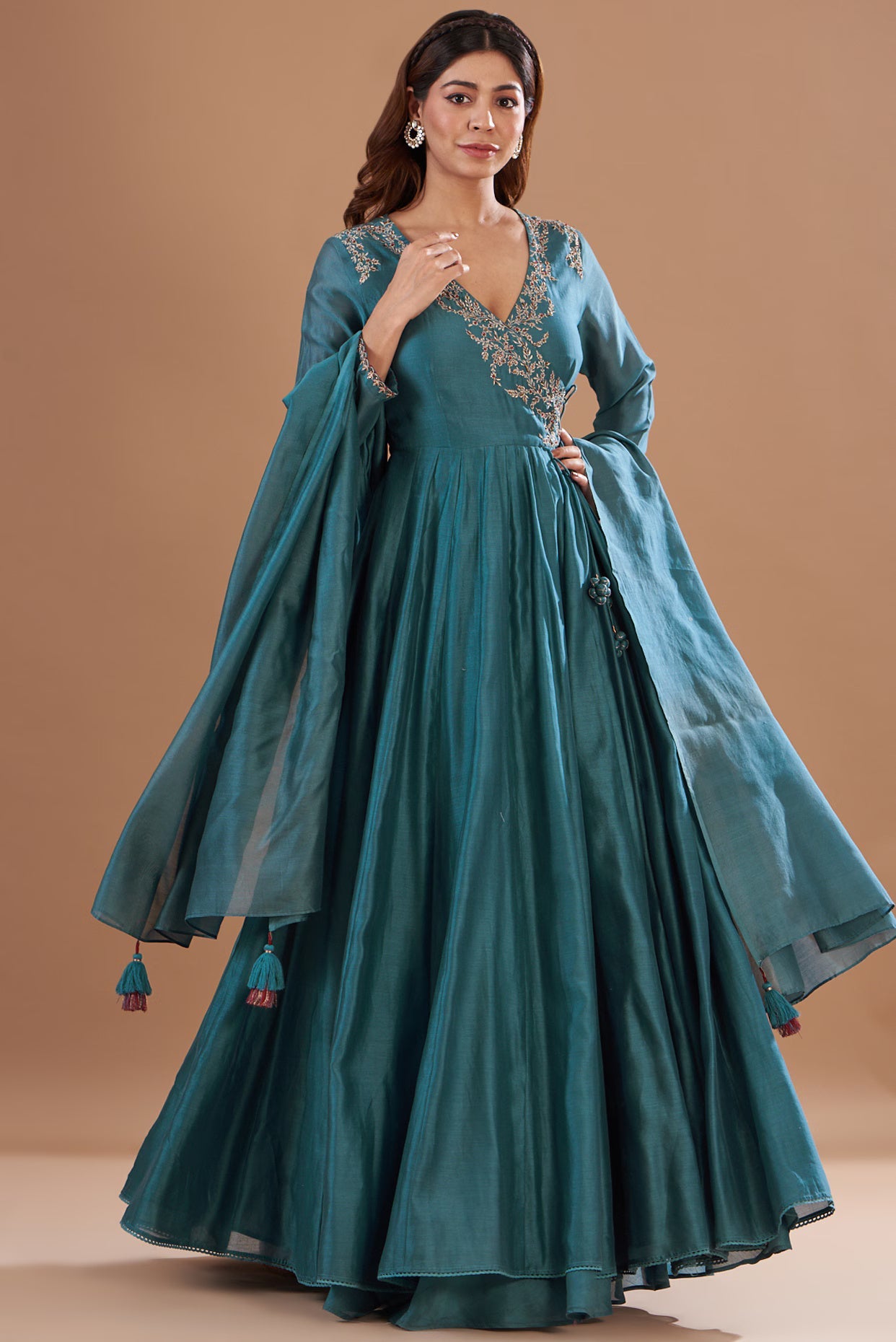 Featuring a blue anarkali in chanderi base with hand embroidery. It is paired with matching pants and a dupatta.