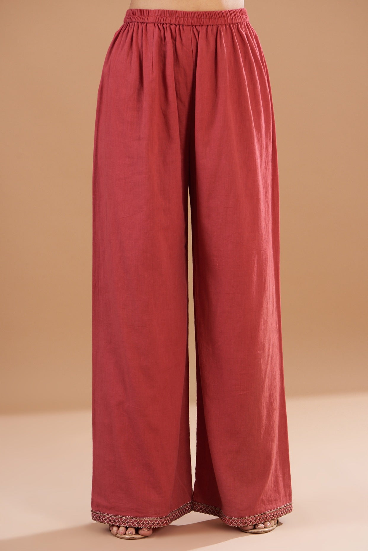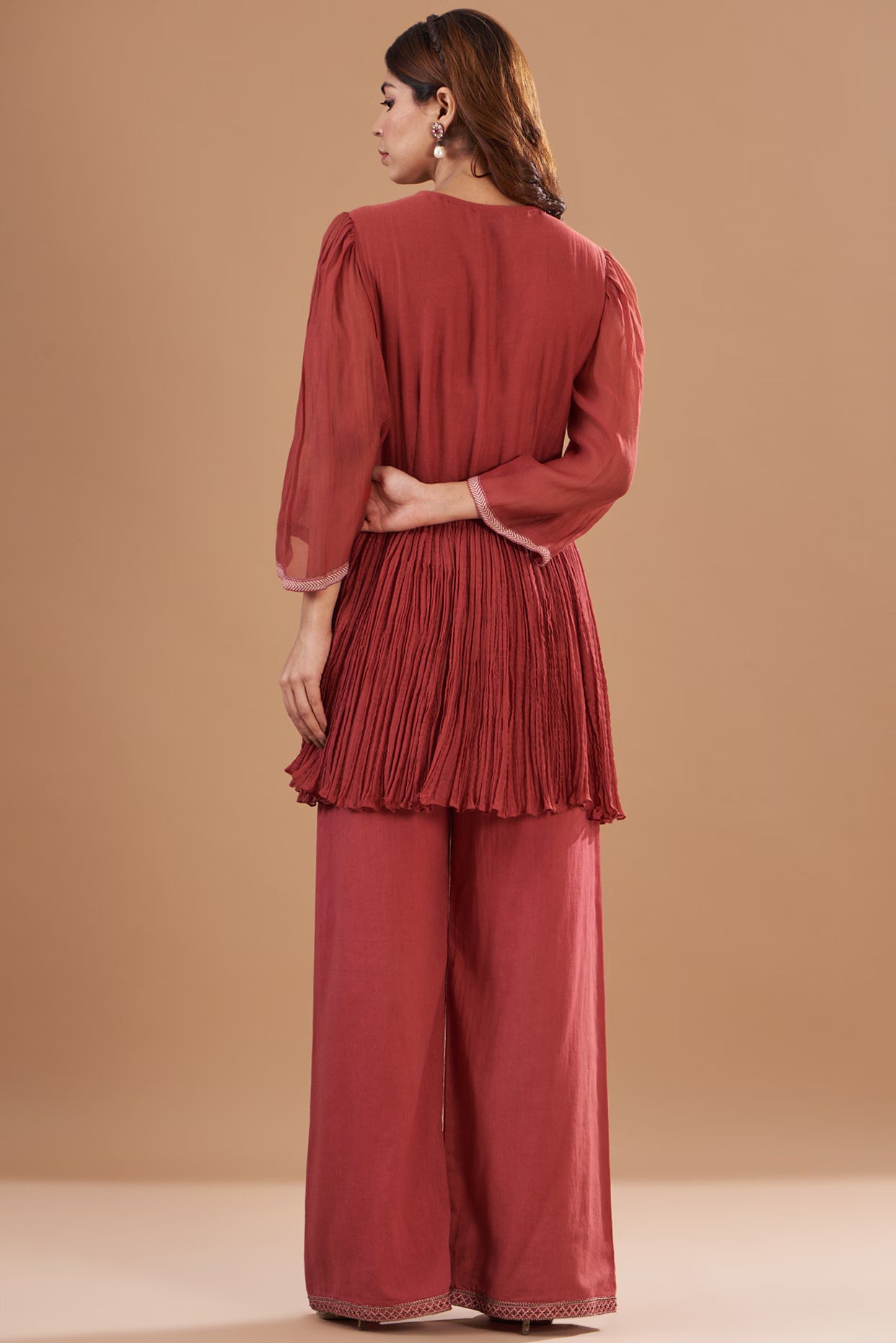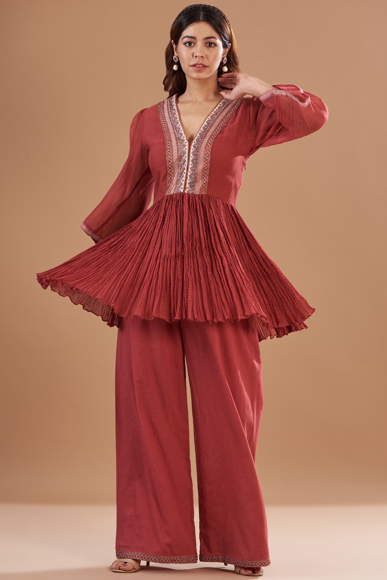 Featuring a red gathered tunic in chanderi base with hand embroidery. It is paired with a matching palazzo pants.