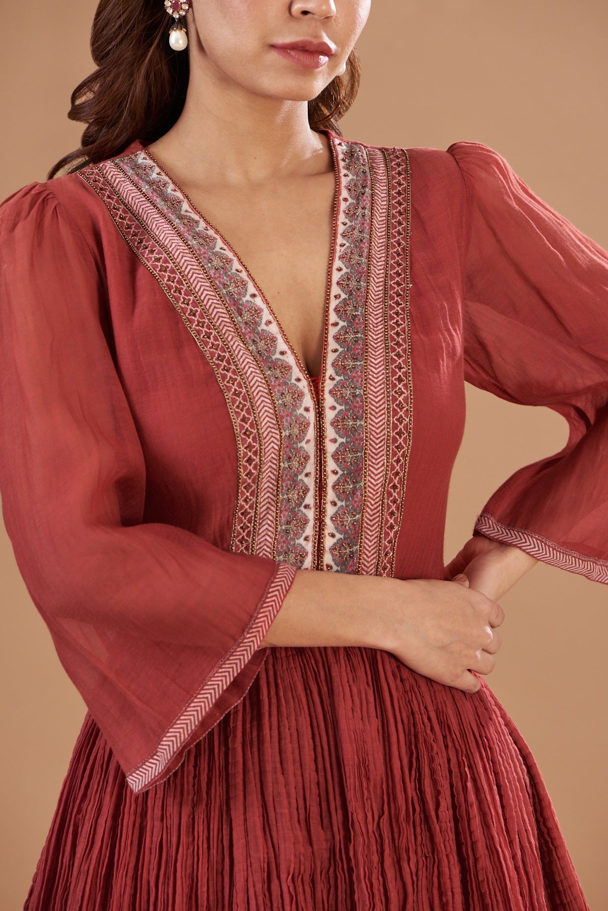 A Timeless Ethnic Elegance, this red gathered tunic is a stunning and elegant garment, crafted from a comfortable chanderi base and adorned with intricate hand embroidery. The soft, smooth texture of the chanderi fabric ensures a luxurious feel, making it perfect for special occasions or everyday wear.