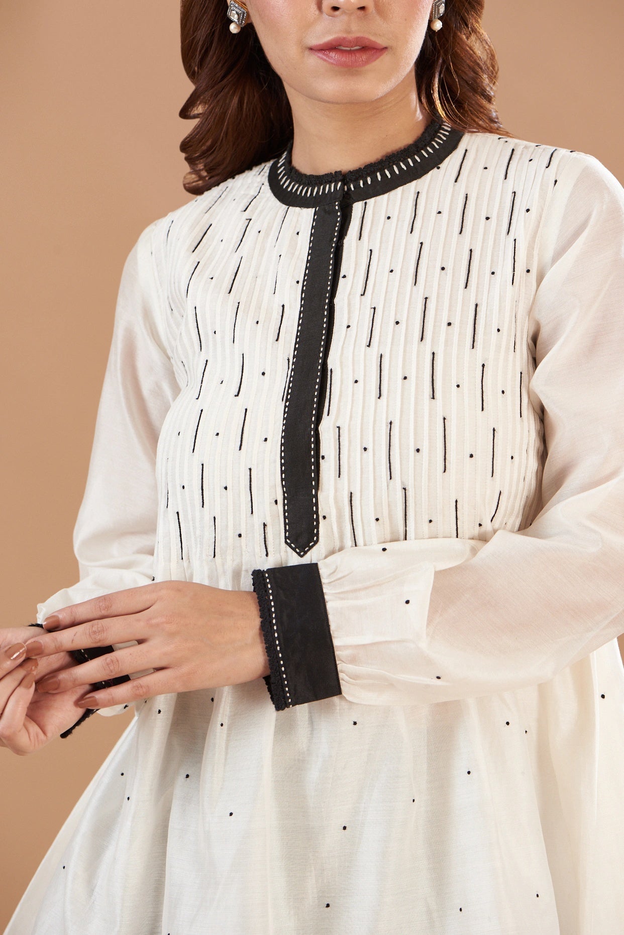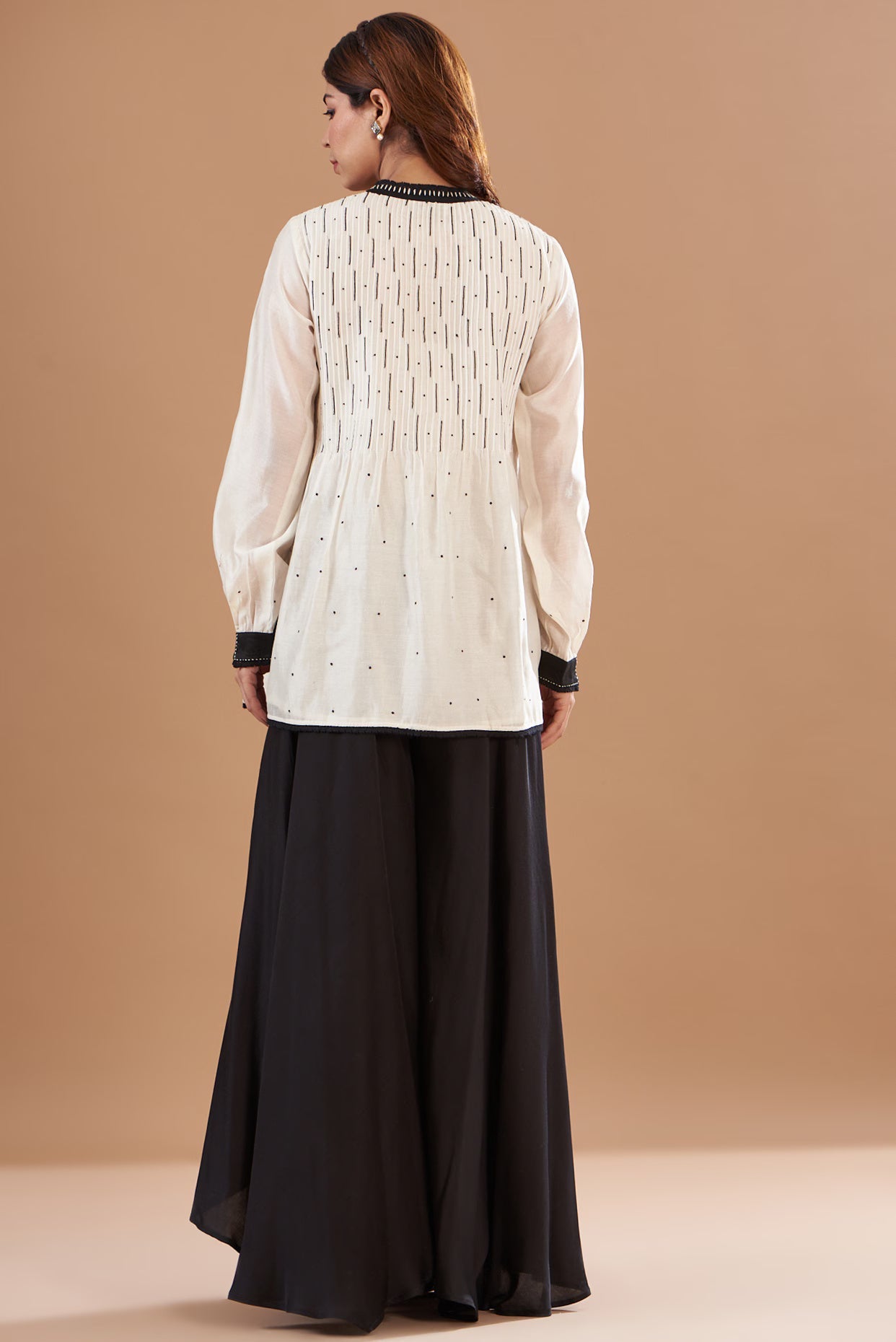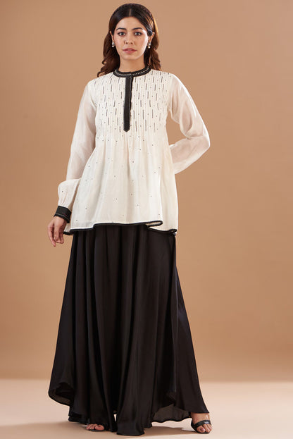 Featuring a white tunic top in cotton satin base with machine embroidery and balloon sleeves. It is paired with a contrasting skirt.
