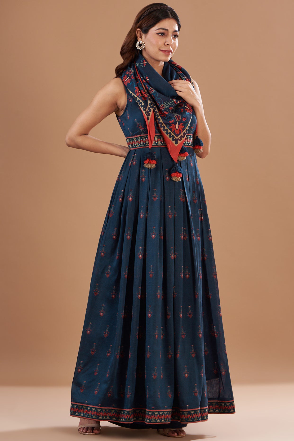 Blue Chanderi Printed & Embroidered Gathered Dress With Scarf