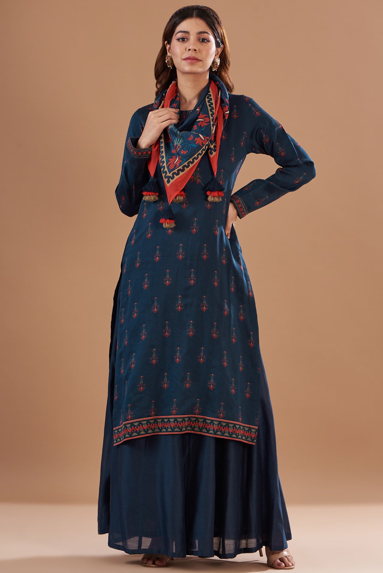Featuring a blue kurta in chanderi base with digital print, hand and machine embroidery. It is paired with a matching skirt and a scarf.