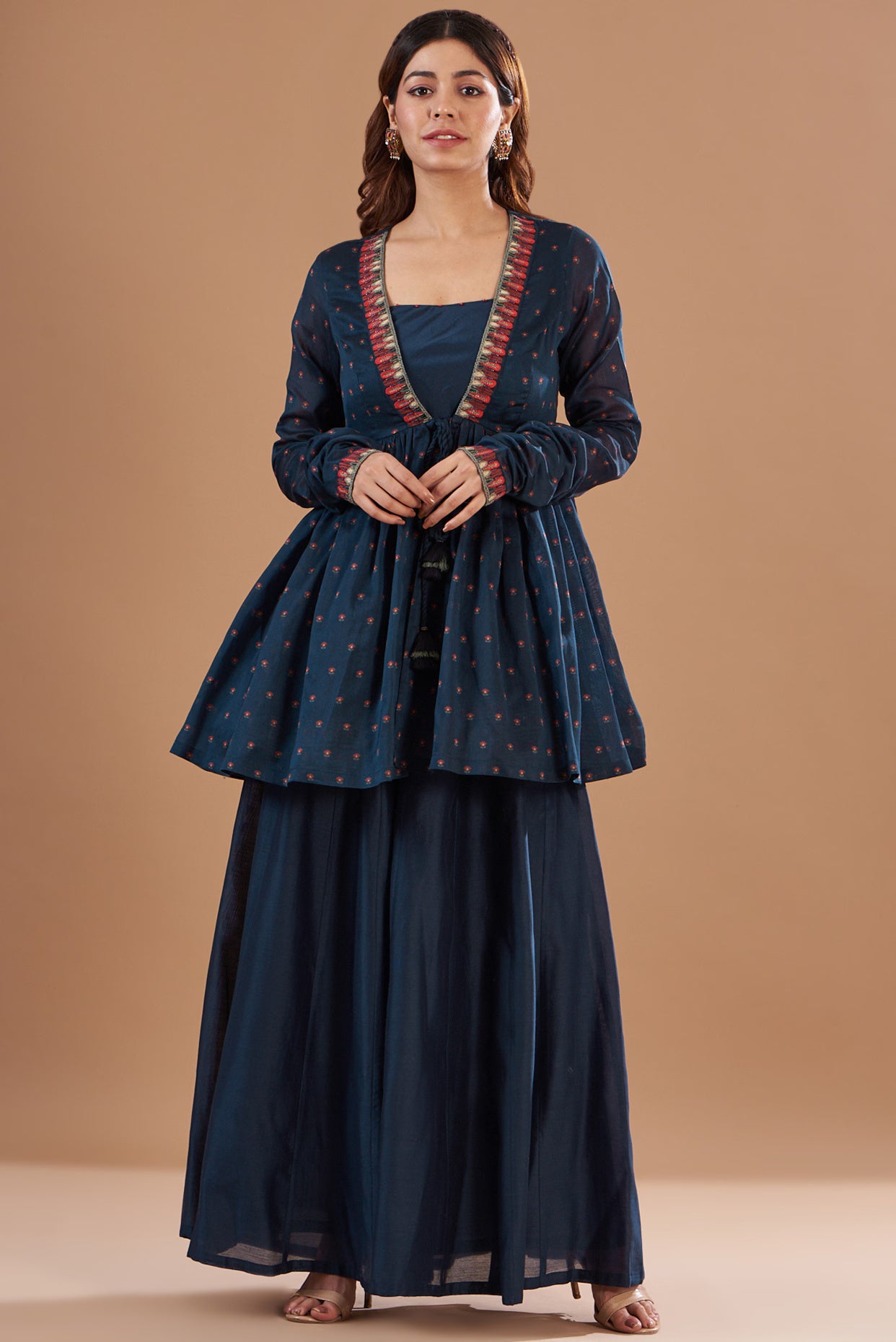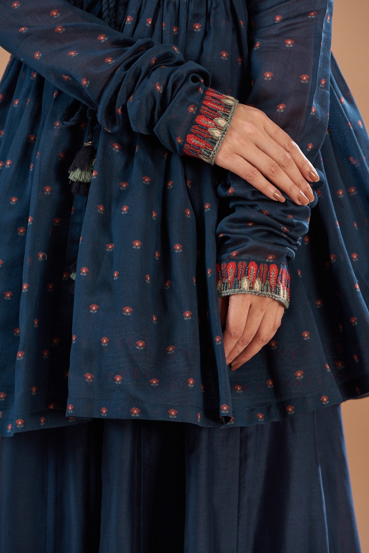 Featuring a blue short kurta in chanderi base with digital print, hand and machine embroidery. It is paired with a matching skirt.