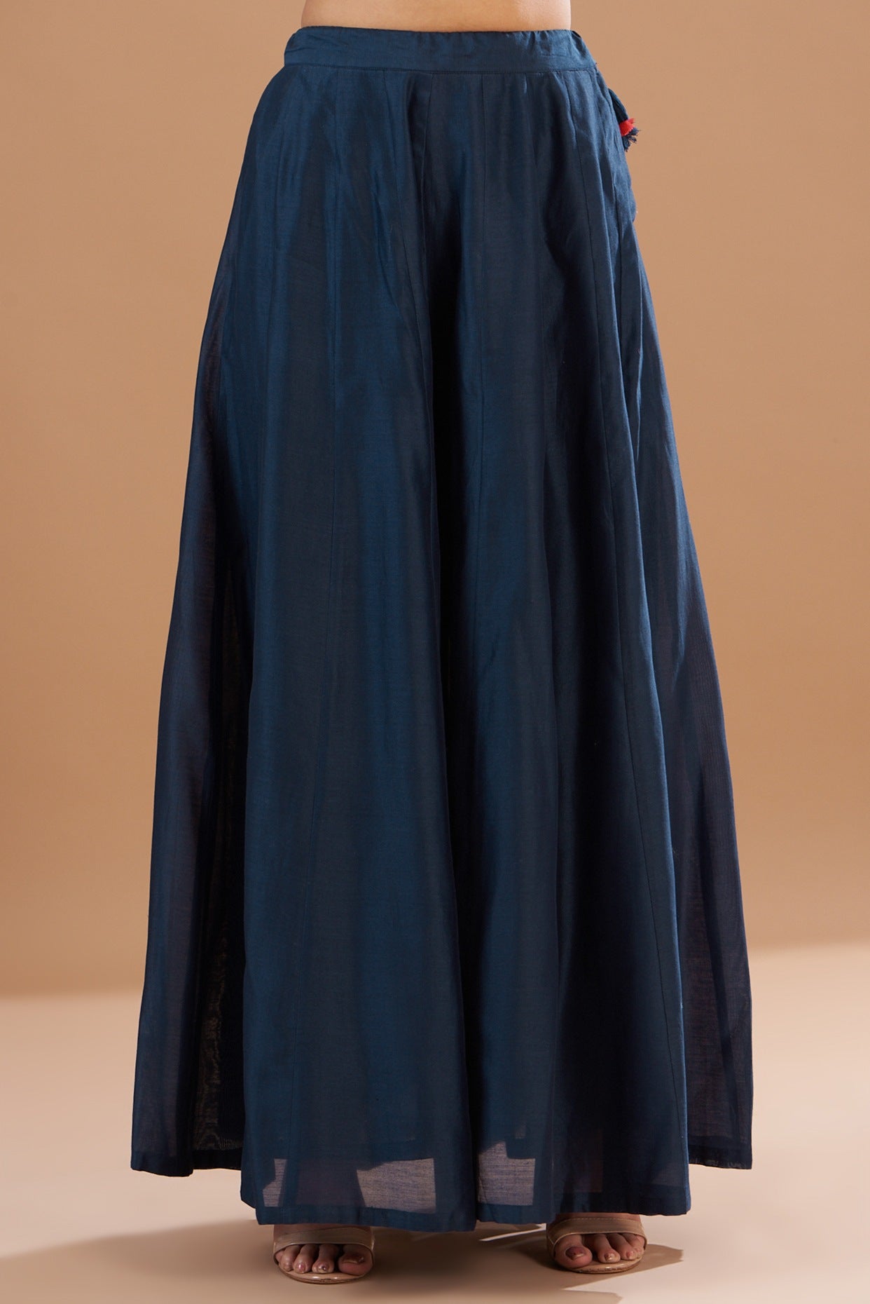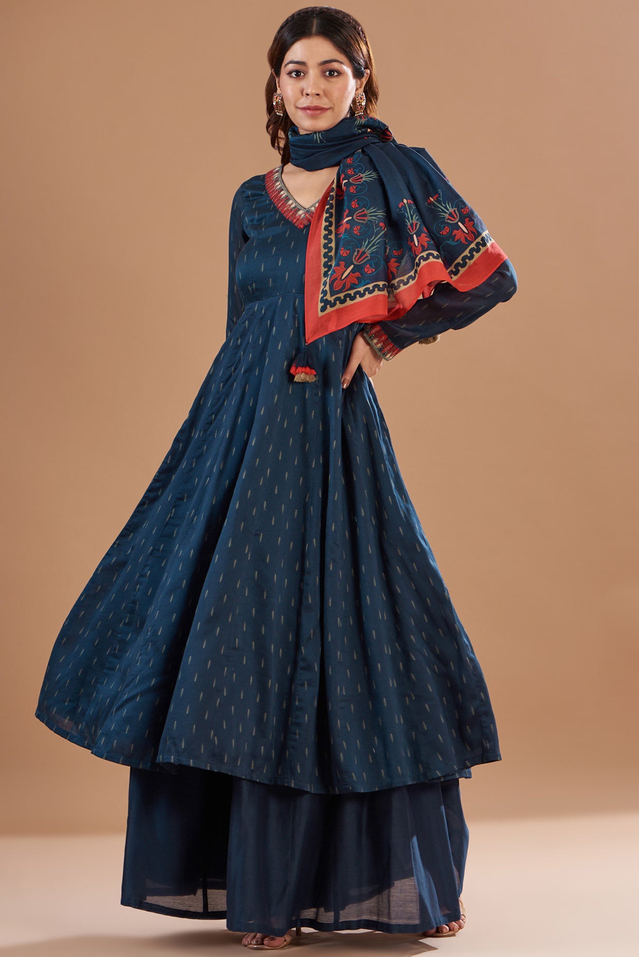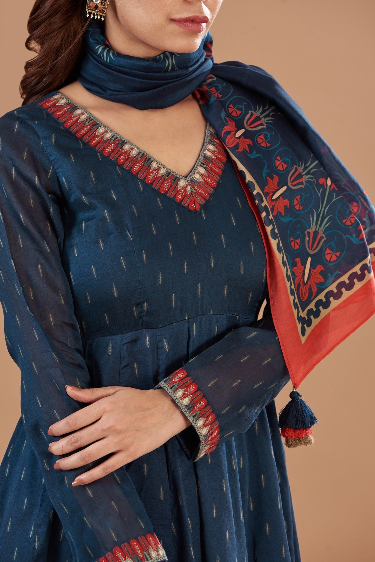 Featuring a blue anarkali in chanderi base with digital print, hand and machine embroidery. It is paired with matching palazzo pants and a scarf.
