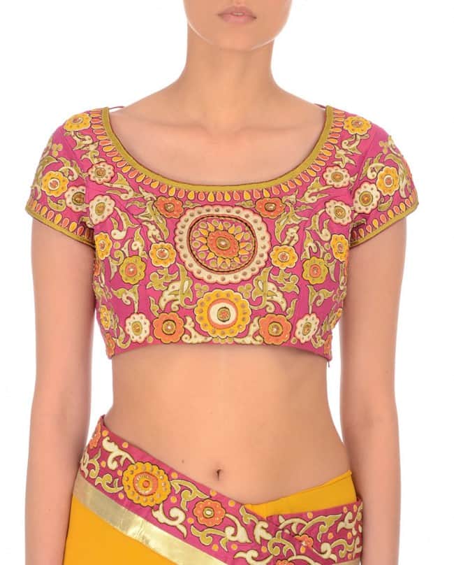 The matching blouse is a work of art, featuring intricate thread embroidery all over, highlighted with exquisite dabka, zardozi, sequins, and beads embroidery, showcasing the pinnacle of craftsmanship. The combination of yellow and fuschia pink hues creates a striking contrast, evoking the warmth and energy of sunshine.