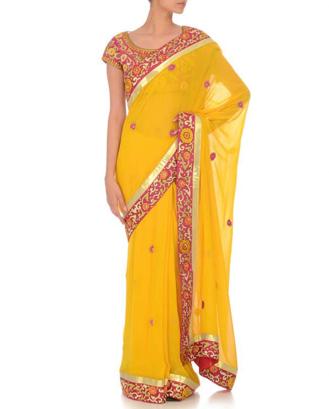 Introducing the radiant Yellow Multicolor Embroidered Sari & Blouse, a masterpiece of vibrant elegance and intricate craftsmanship. This stunning yellow thread work sari is adorned with a bold fuschia pink embroidered heavy border, expertly crafted to create a truly breathtaking effect.