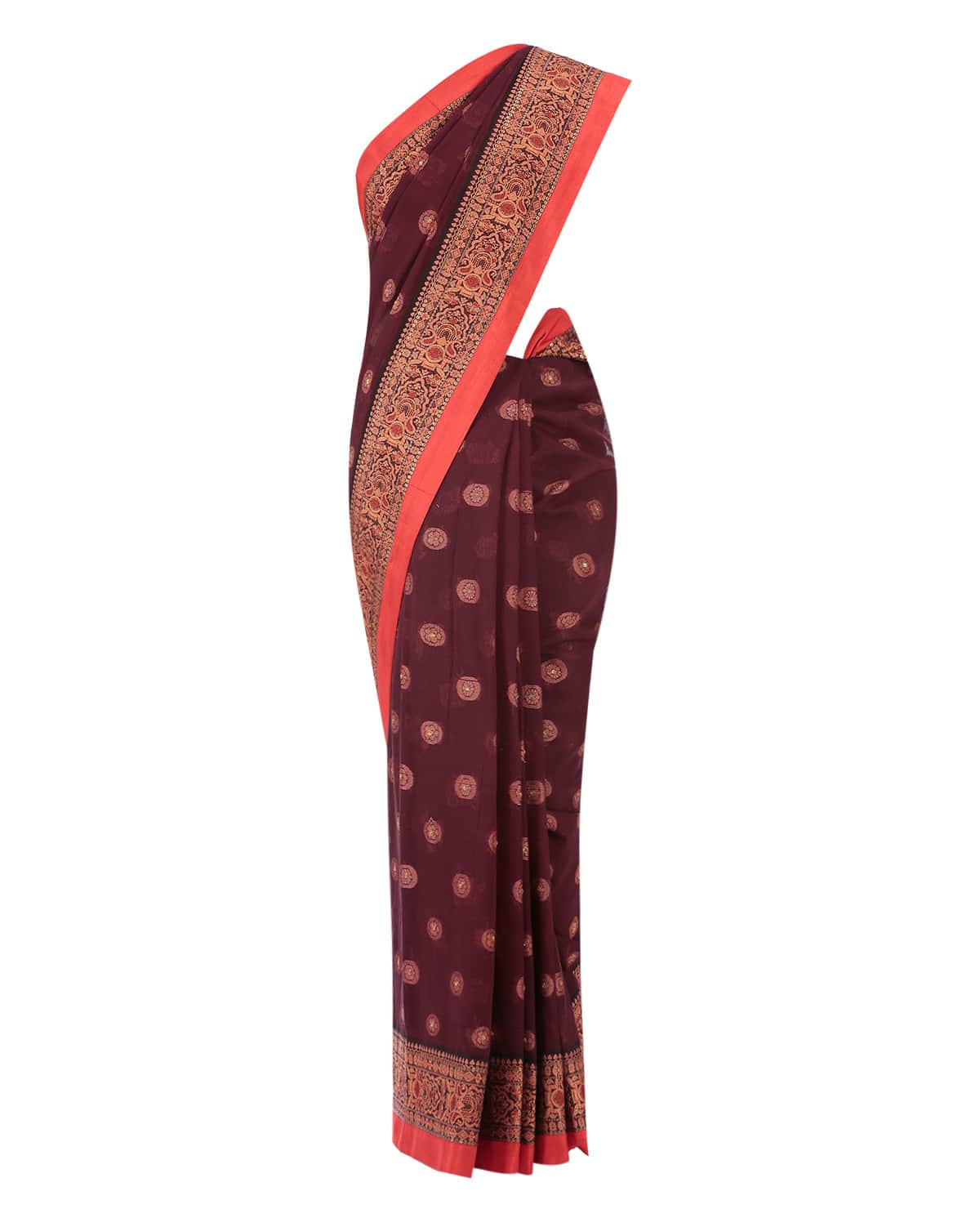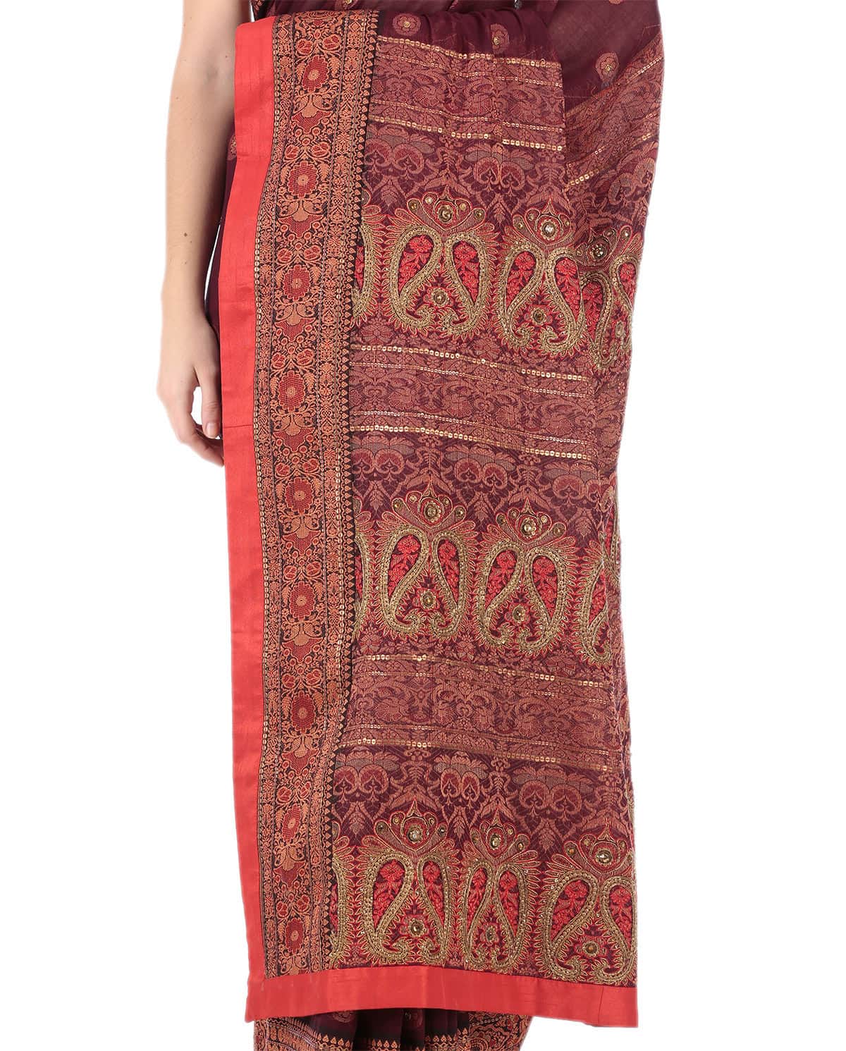 This handwoven berry red sari is a testament to the richness and diversity of traditional craftsmanship, making it a true treasure for any sari connoisseur. Its unique blend of elegance, sophistication, and whimsy makes it a perfect choice for anyone looking to make a statement. The intricate embroidery, luxurious fabrics, and bold color palette make it perfect for special occasions, exuding timeless charm and glamour.