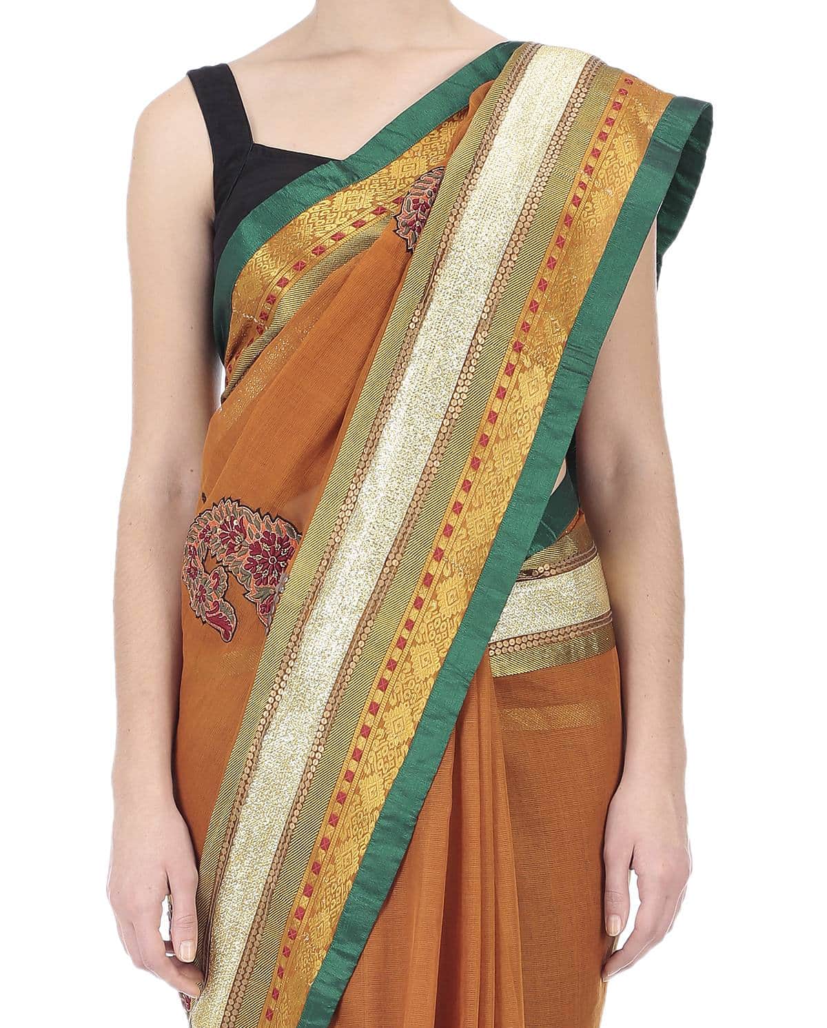 The accompanying plain blouse piece provides a subtle complement to the sari's vibrant hue, allowing the intricate embroidery and luxurious fabrics to take center stage. This handwoven fire yellow sari is a true treasure for any sari connoisseur, showcasing the richness and diversity of traditional craftsmanship.
