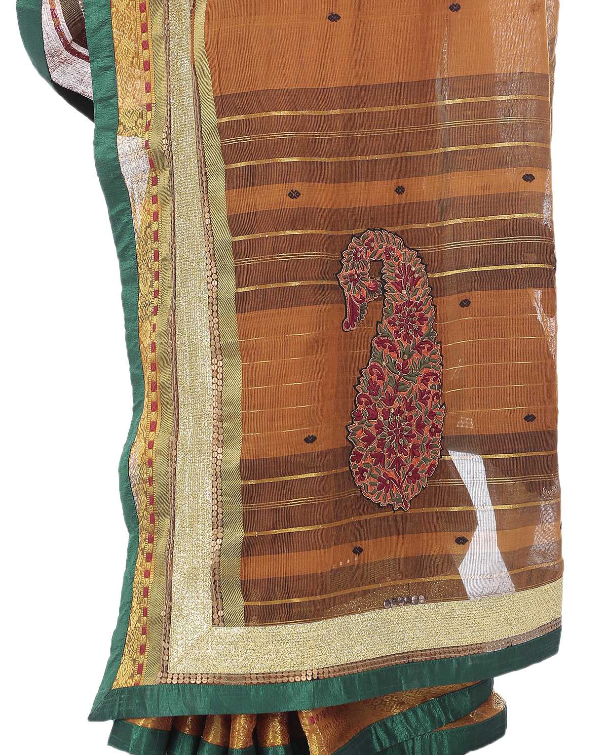 The delicate bootas shimmer with intricate sequin embroidery, adding a touch of whimsy and romance. The sari's pallu is elegantly framed by a thick woven border and thin green silk border, creating a striking contrast that adds to its allure.