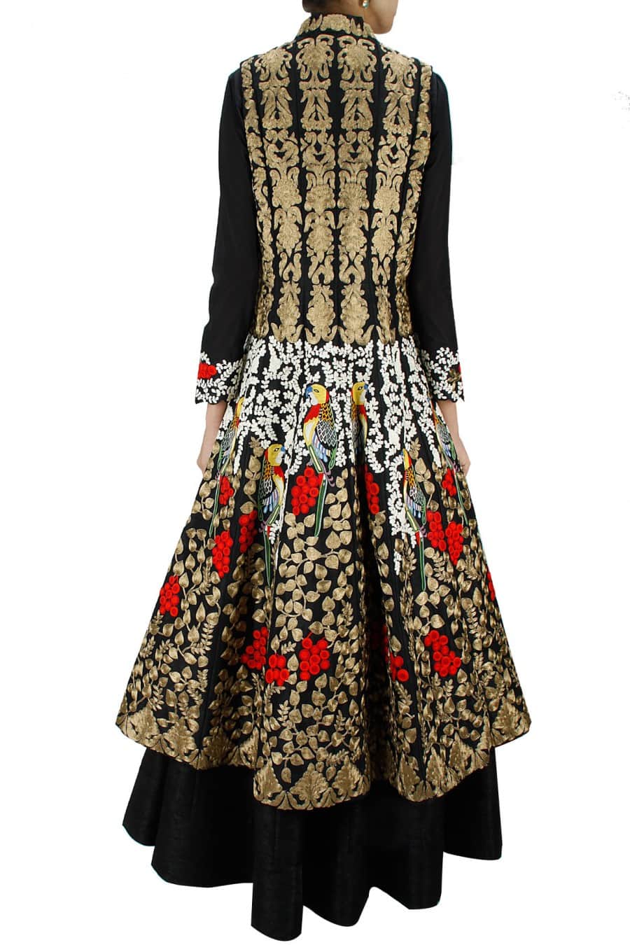 - Flared jacket fully embroidered with zari, showcasing bird and leaf motifs