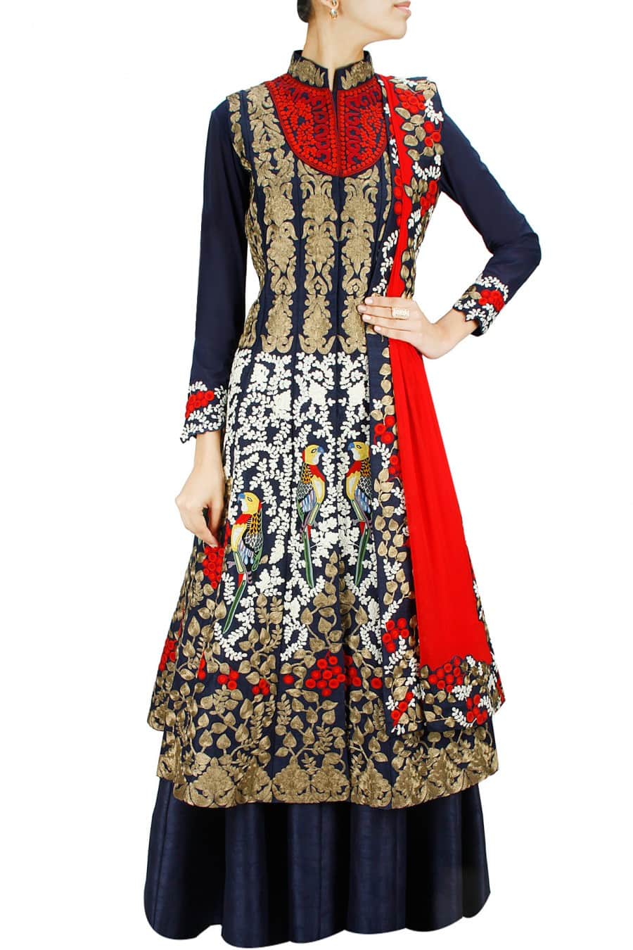 - Flared jacket fully embroidered with zari, showcasing intricate bird and leaf motifs