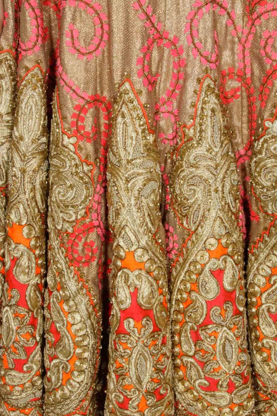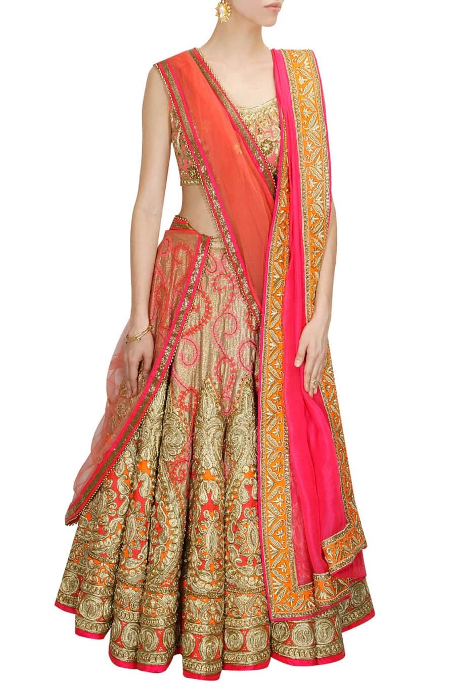 - 22-panelled lehanga with intricate zari, dori, french knots, crystals, sequins, resham, and chiffon strip embroidery
