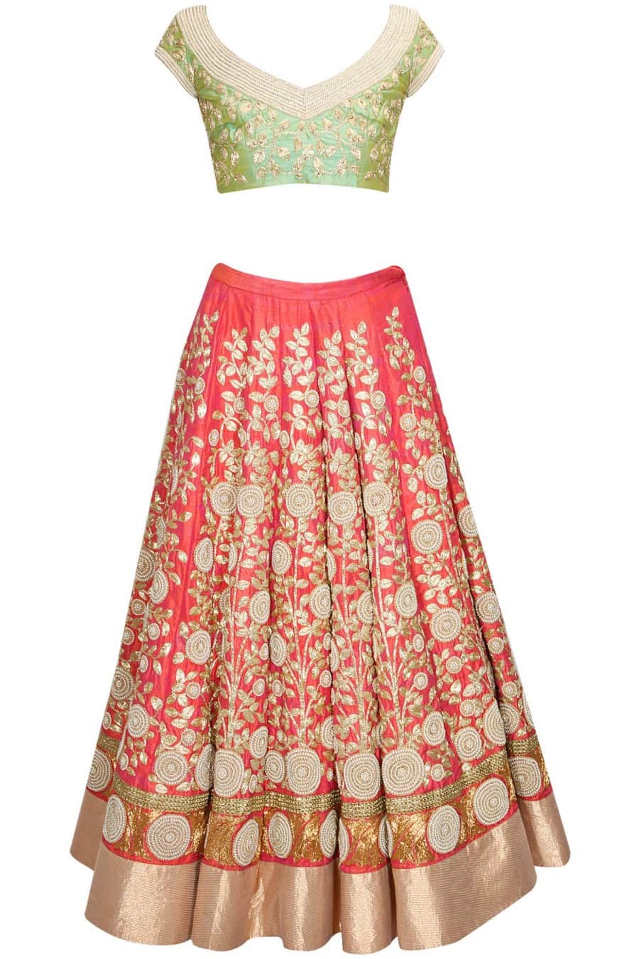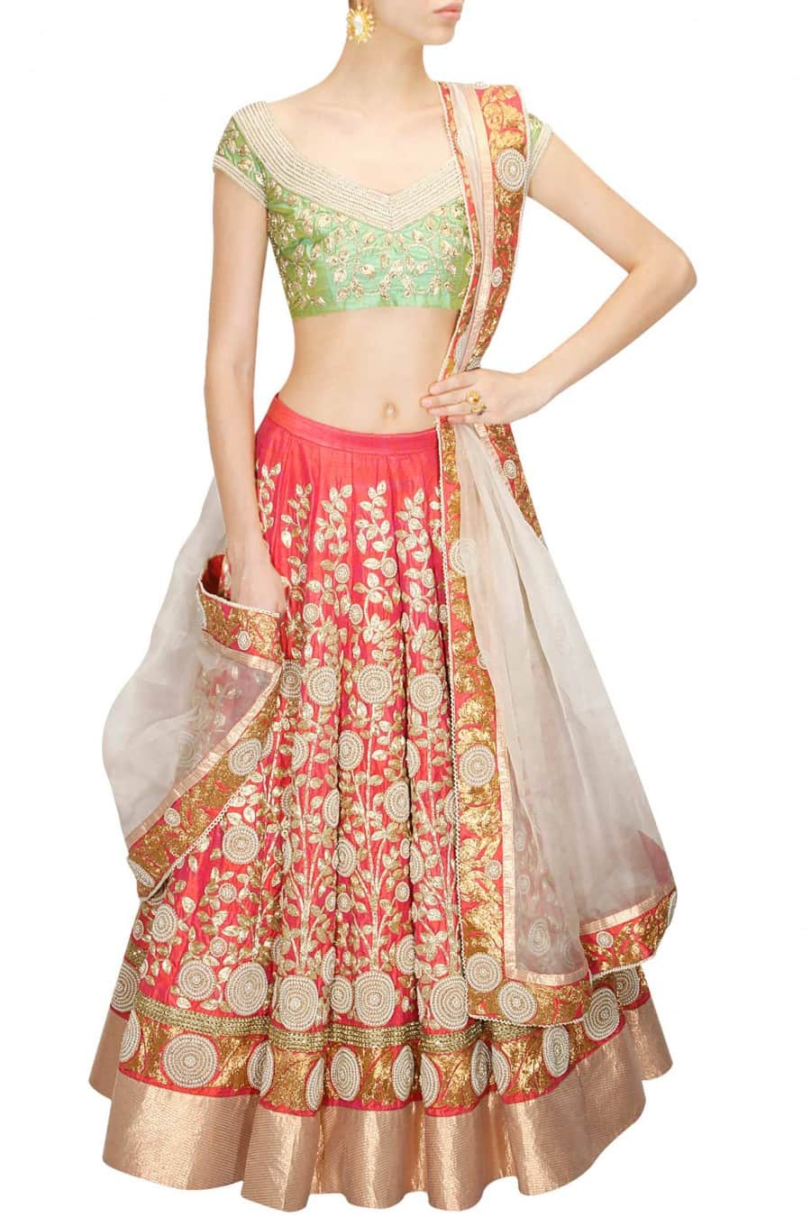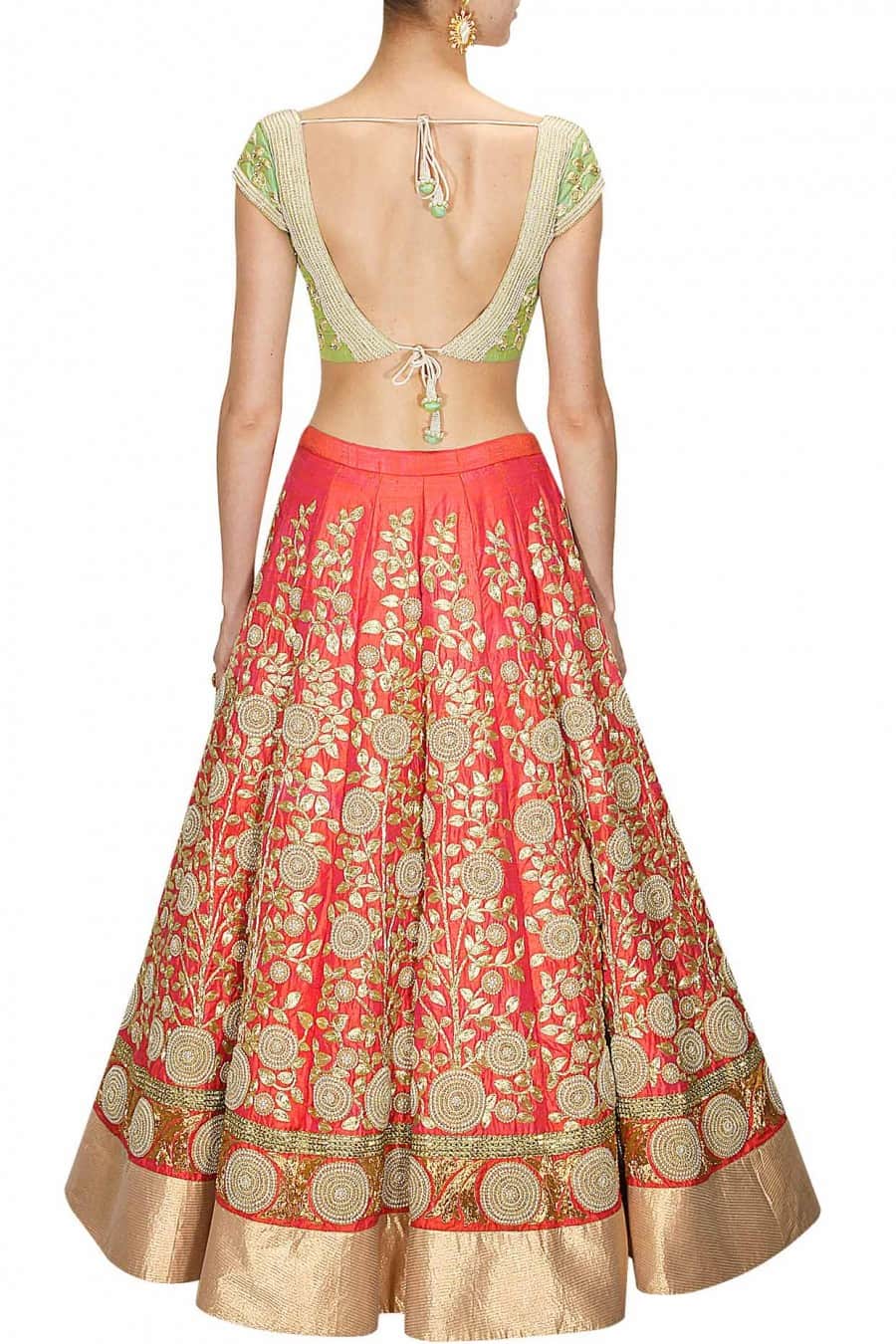 - Coral lehanga with intricate zari, dori, french knots, pearls, and sequin embroidery