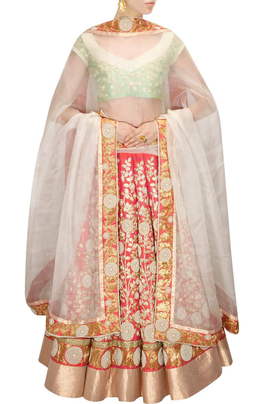 Elevate your wedding style with this stunning mint green, coral, and ivory couture lehenga set. This three-piece bridal masterpiece features: