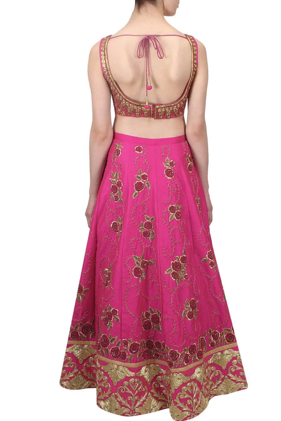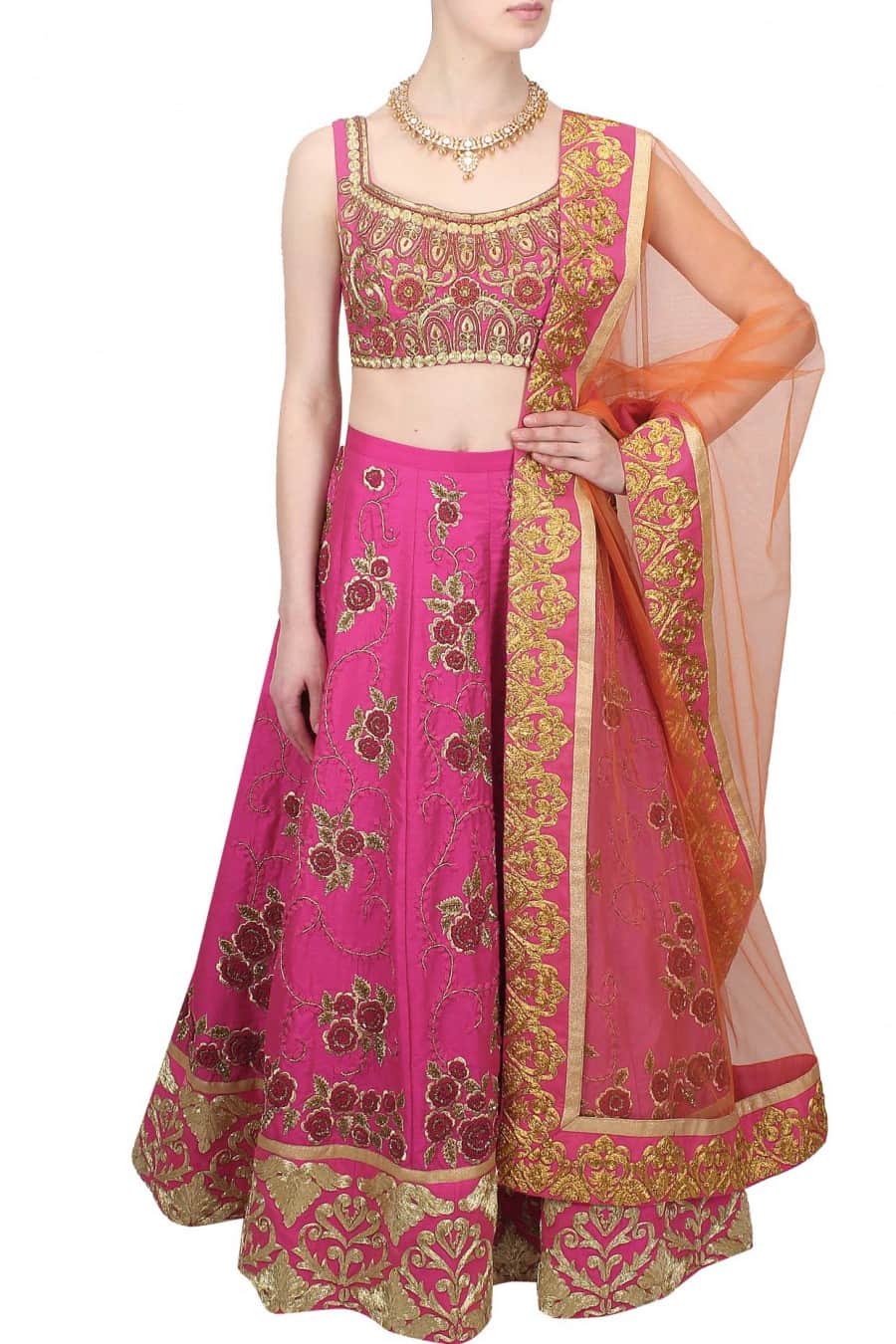 Experience the ultimate in bridal sophistication with this stunning fuschia pink embroidered lehenga set. The set features: