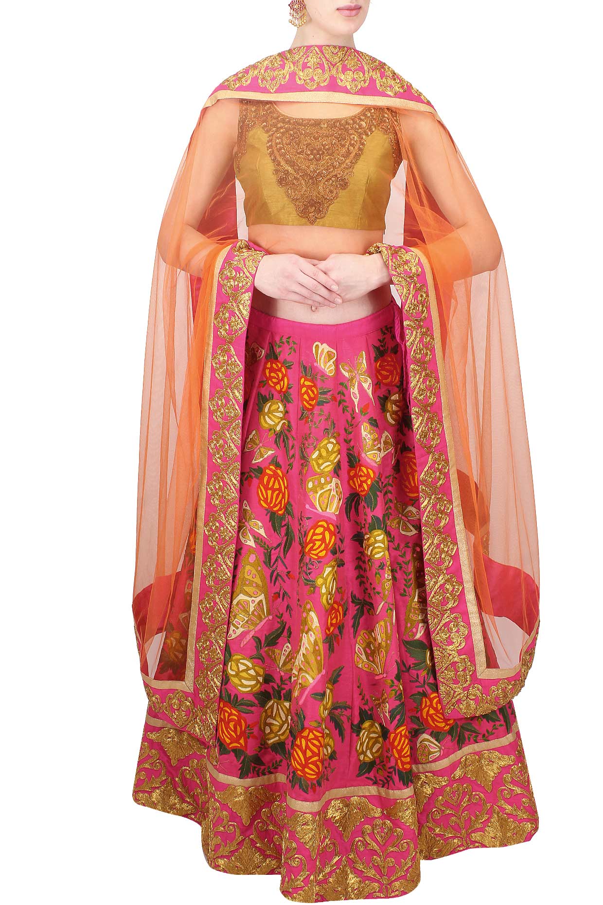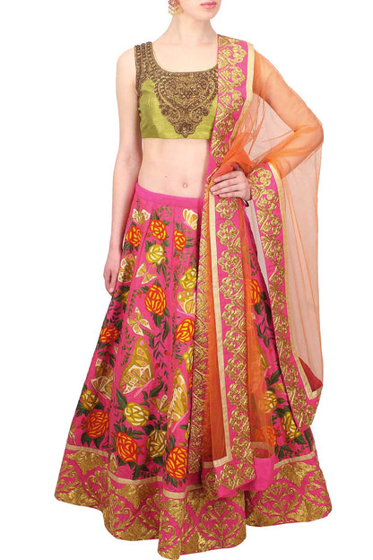 This set features a pink flared lehenga in silk base crafted with multicoloured zardozi, resham and zari hand embroidery in butterfly and floral pattern all over the ghera. It had gold and pink silk thread embroidered border around the hem. It is paired with lime green silk blouse with zardozi and sequins embroidery on the front and back neckline. It comes along with orange net dupatta with gold and pink embroidered border.