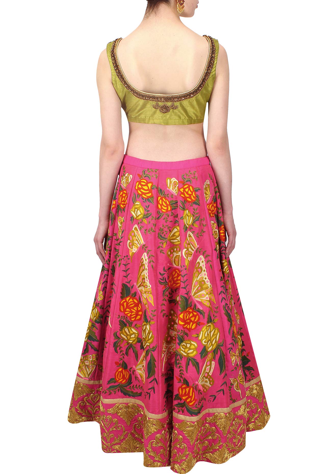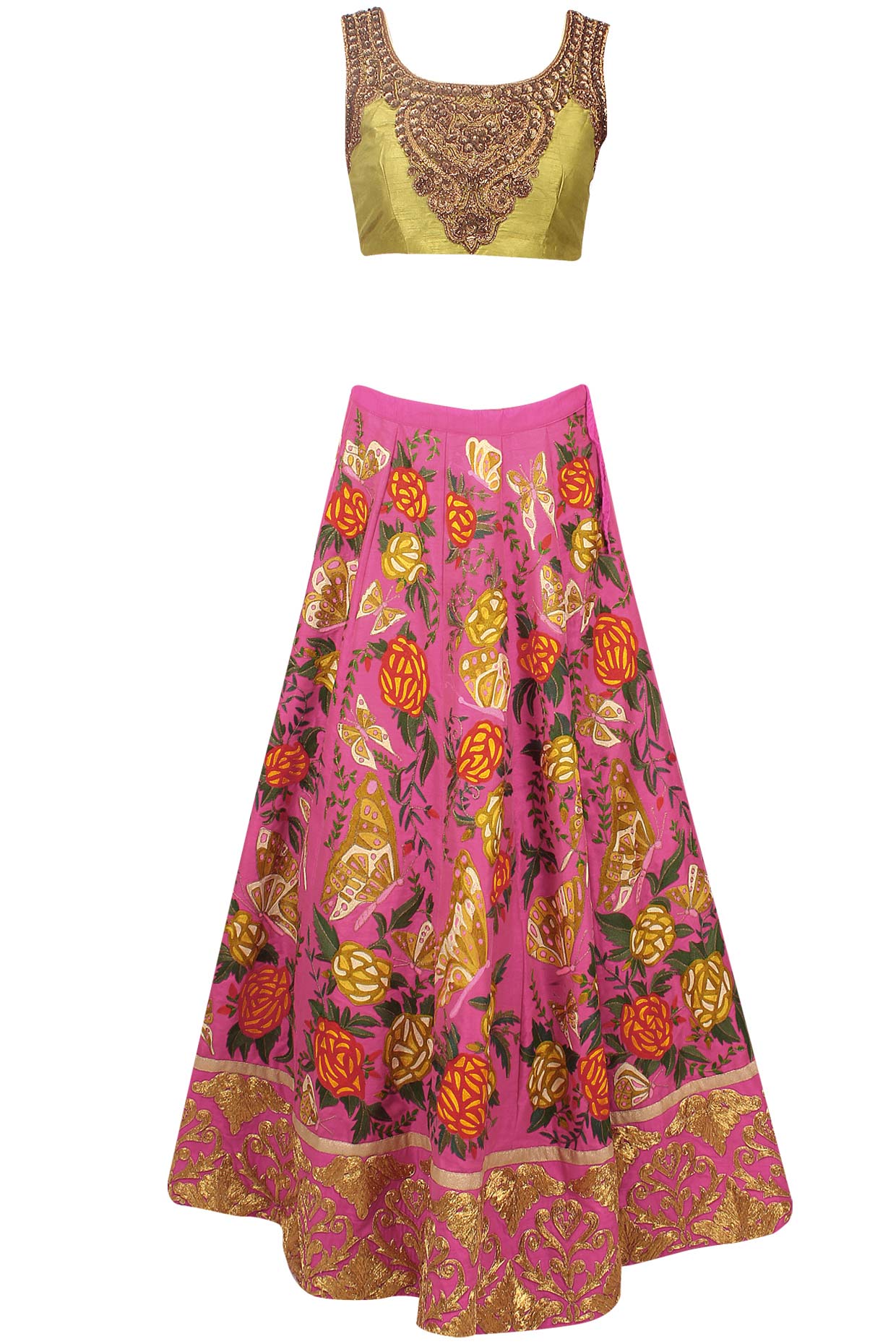 Pink Butterfly and Floral Embroidered Lehenga and Lime Green Blouse Set