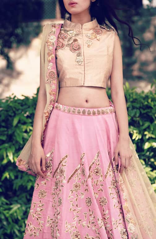 Pink Floral Zardozi and Resham Embroidered Lehenga and Gold Blouse Set