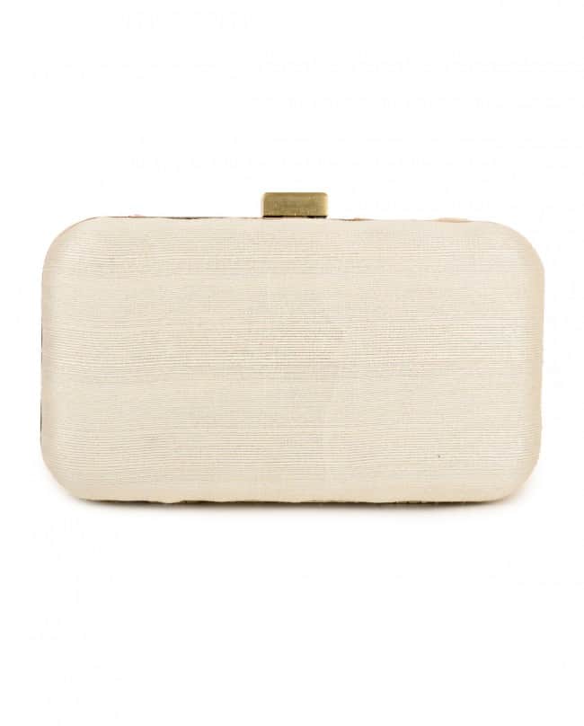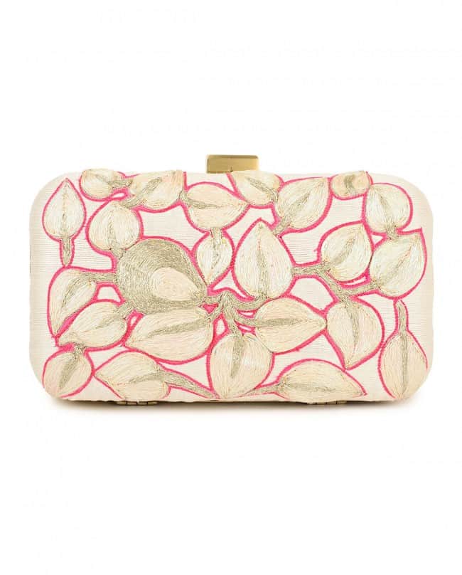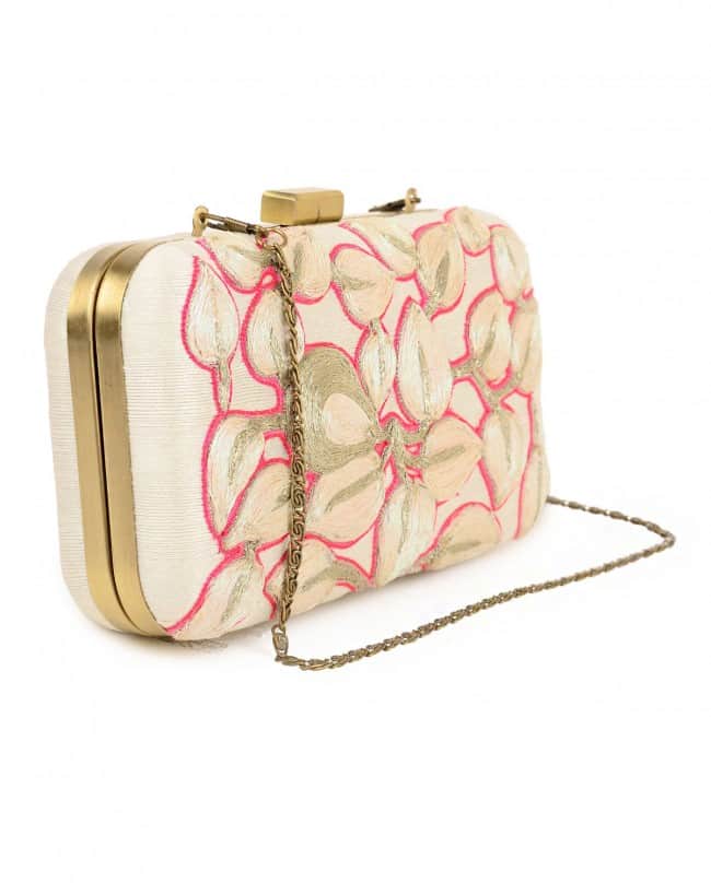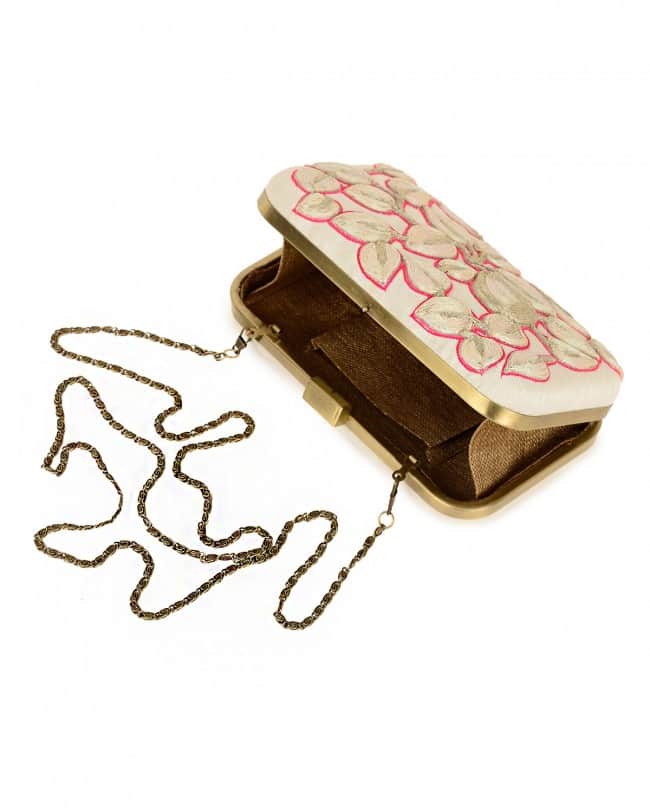 Elegant ivory and silver clutch in a stylish cuboid shape, featuring intricate embroidery of leaves and fruits in ivory zari, silver zari, and coral resham work. Complete with a hard metal rim, brass button, and gold sling chain for a luxurious finish.