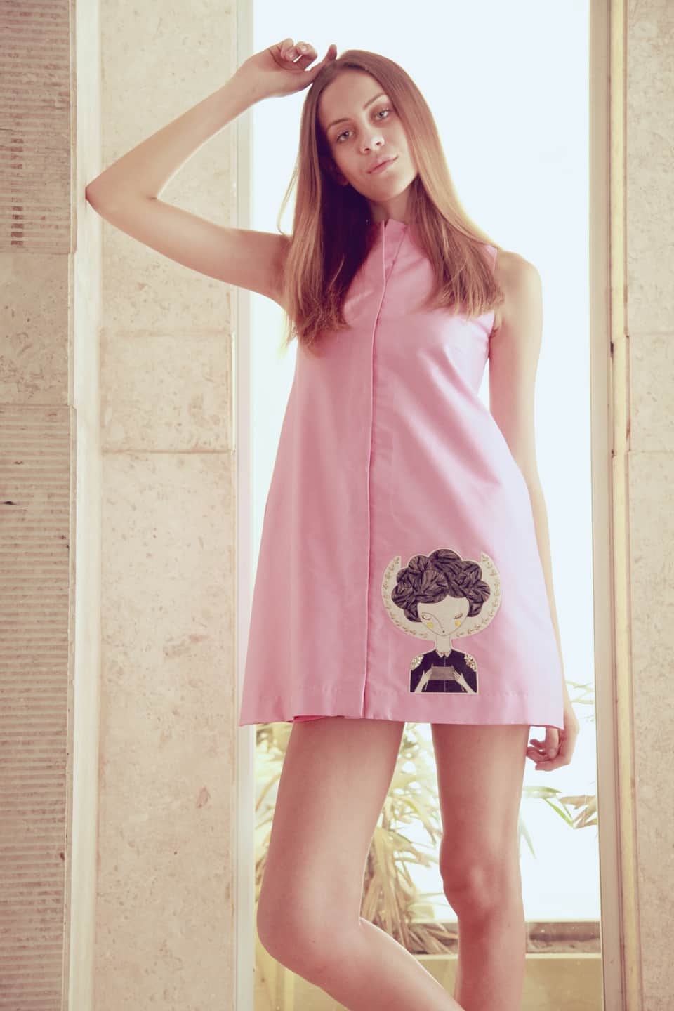 Elevate your style with this charming baby pink vintage short dress, featuring a quirky girl's face appliqué. The dress is beautifully embellished with beads, crystal, zari, and black thick thread, showcasing creative techniques. With a front open design and embroidery appliqué on one side, this dress is a unique and eye-catching statement piece.