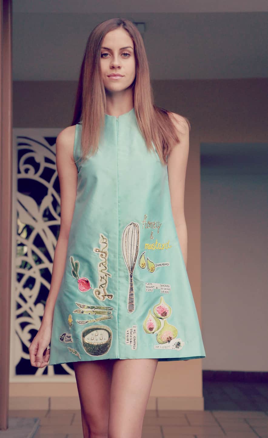 Add a pinch of whimsy to your wardrobe with this pale blue front open vintage short dress, showcasing quirky food-inspired print motifs. Beautifully appliqued and embellished with beads, crystal, zari, and various threads, this dress is a recipe for style.