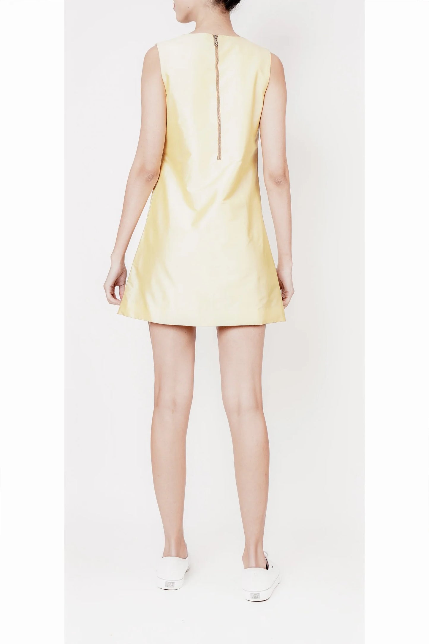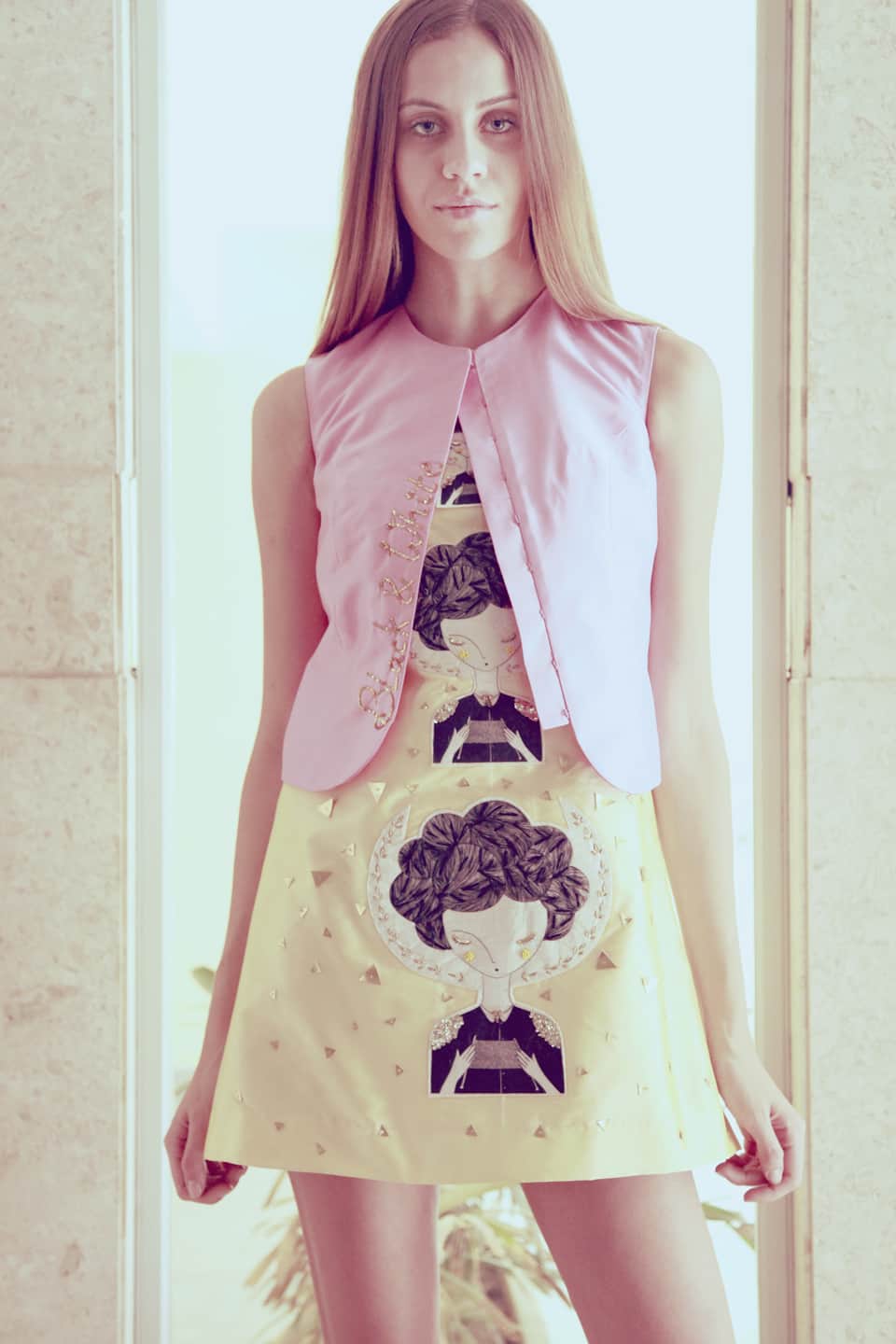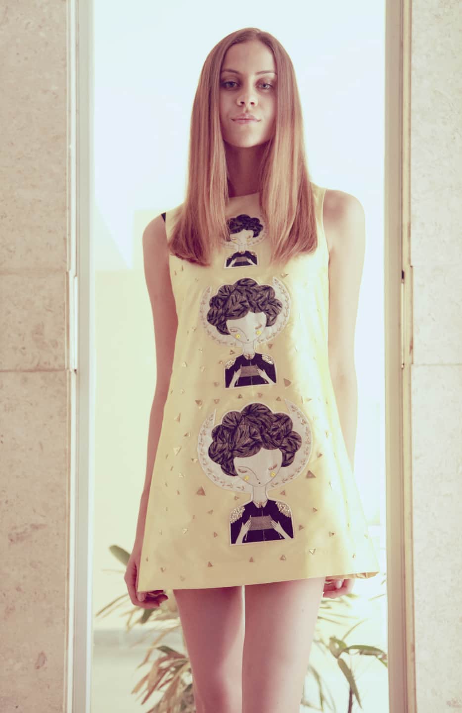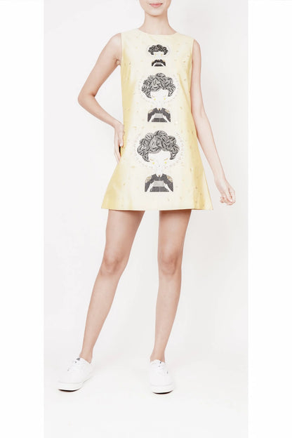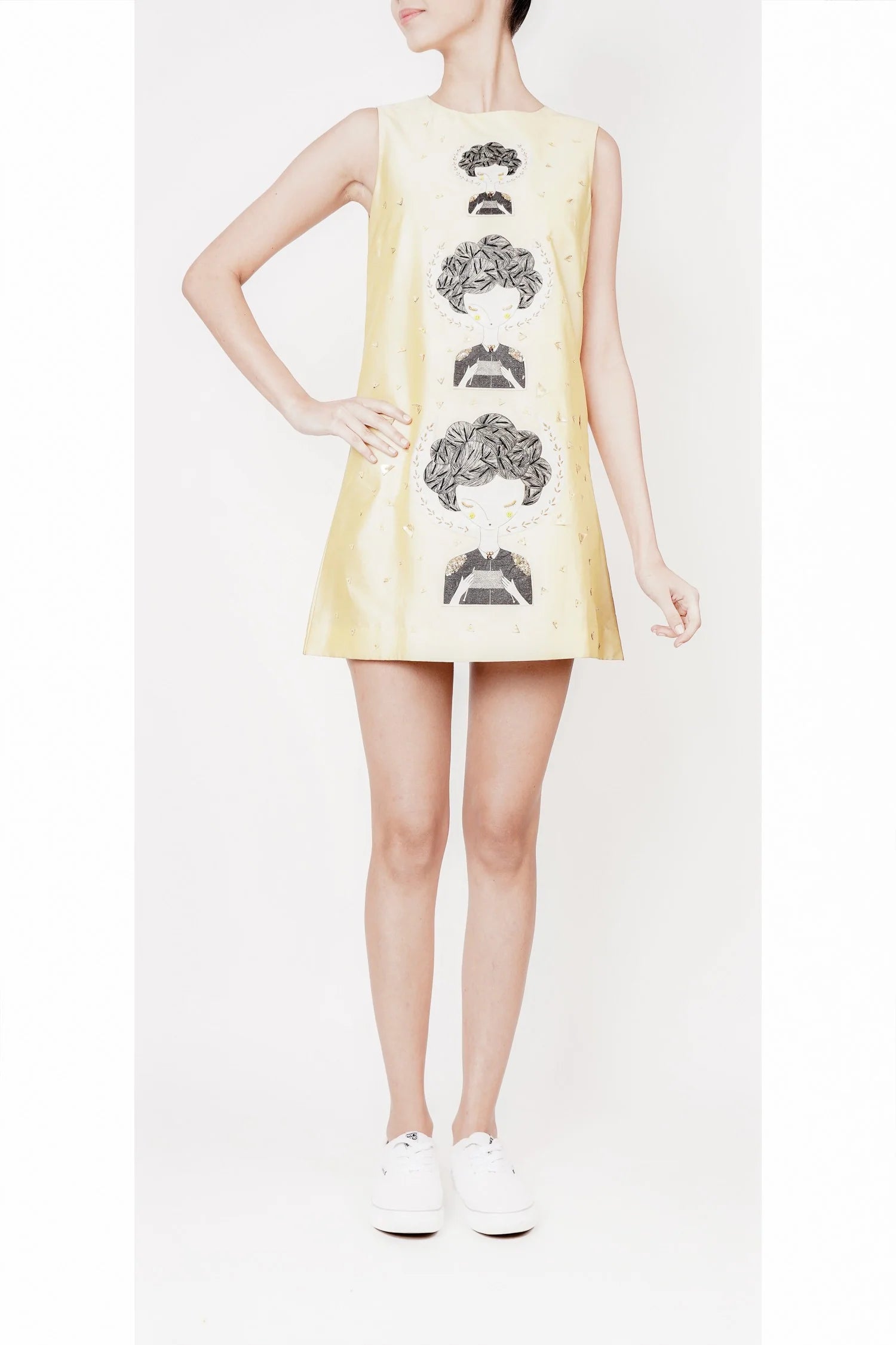Elevate your style with this beige quirky vintage short shift dress, featuring three appliqued girl's faces knitting a scarf in different sizes. Embellished with beads, crystal, zari, and black thick thread, and scattered with gold triangles, this dress is a unique blend of playfulness and elegance.