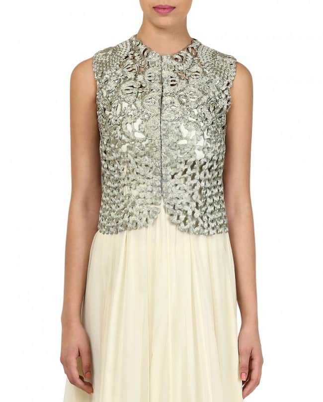 Make a statement with this breathtaking set featuring a silver cutwork jacket in apple cut style, showcasing exquisite silver work on the front opening hemline and cut sleeves. The jacket's unique cutwork design adds a touch of modernity and sophistication, while the off-white flared suit with broad border provides a elegant and refined contrast. The combination of silver and off-white creates a striking visual effect, perfect for formal events, weddings, or special occasions where you want to shine. The flared suit adds a touch of drama and movement, making this set a true showstopper