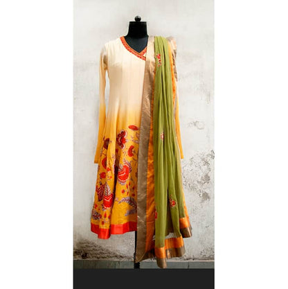 Shaded Angrakha Anarkali Set - This beautiful Anarkali set features a unique shaded effect, gradating from white to yellow, in the traditional Angrakha style. The set boasts a stunning floral print all over, adding a touch of elegance. Paired with a matching green dupatta, this set is perfect for formal events and special occasions. The Angrakha style, with its overlapping layers, adds a touch of sophistication, while the shaded effect and floral print create a striking visual effect