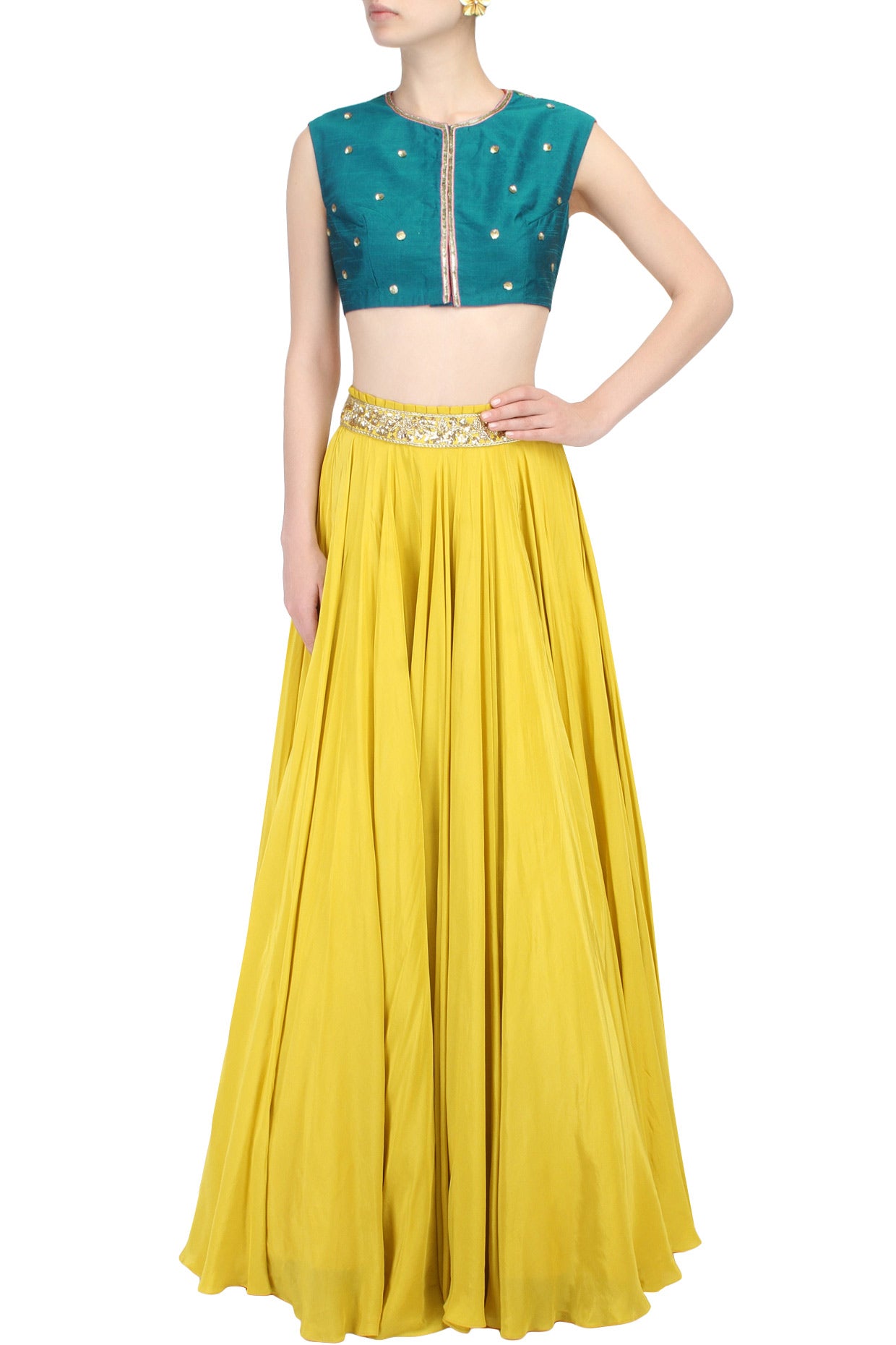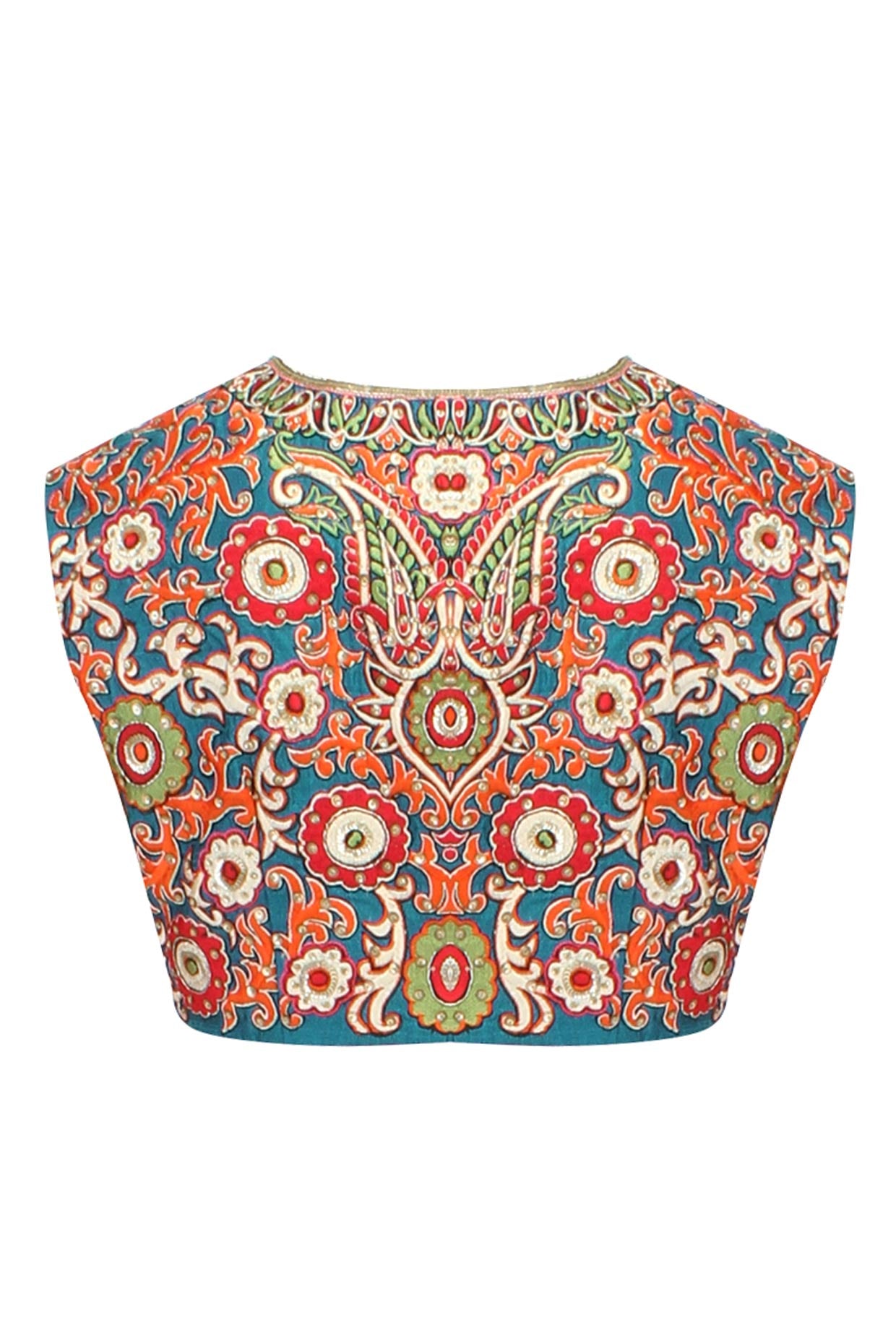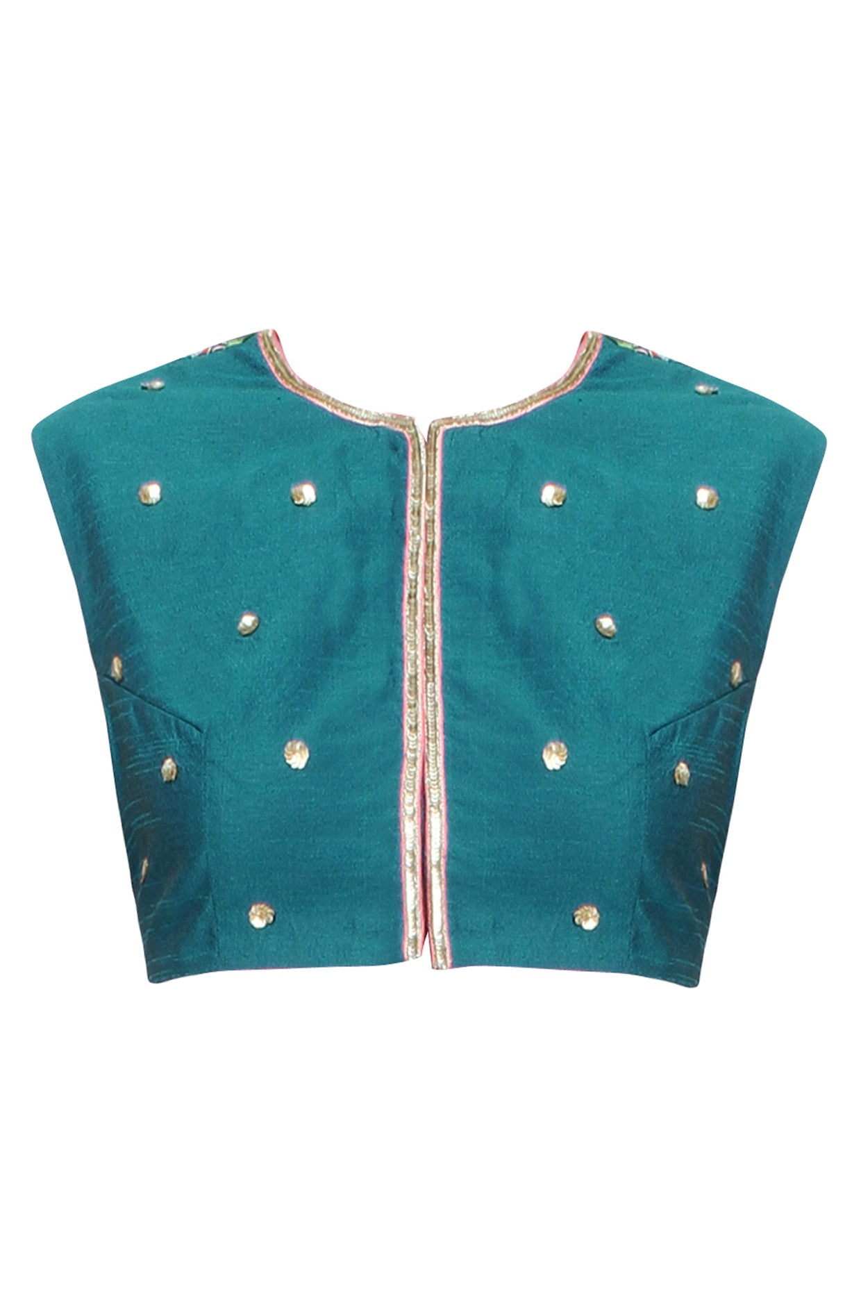 Elevate your traditional style with this breathtaking teal blouse, featuring a high round neckline with light embellishments all over the front and a front opening. The true showstopper is the back, with full, all-over floral embroidery that adds a touch of elegance and sophistication. The gottapati border work around the neckline and opening area adds a delicate, intricate touch. Perfect for special occasions like weddings, festivals, or parties, this blouse can be paired with a lehenga or saree for a stunning look. The unique combination of teal hue, floral embroidery, and gottapati border makes this blouse a standout piece in your wardrobe.