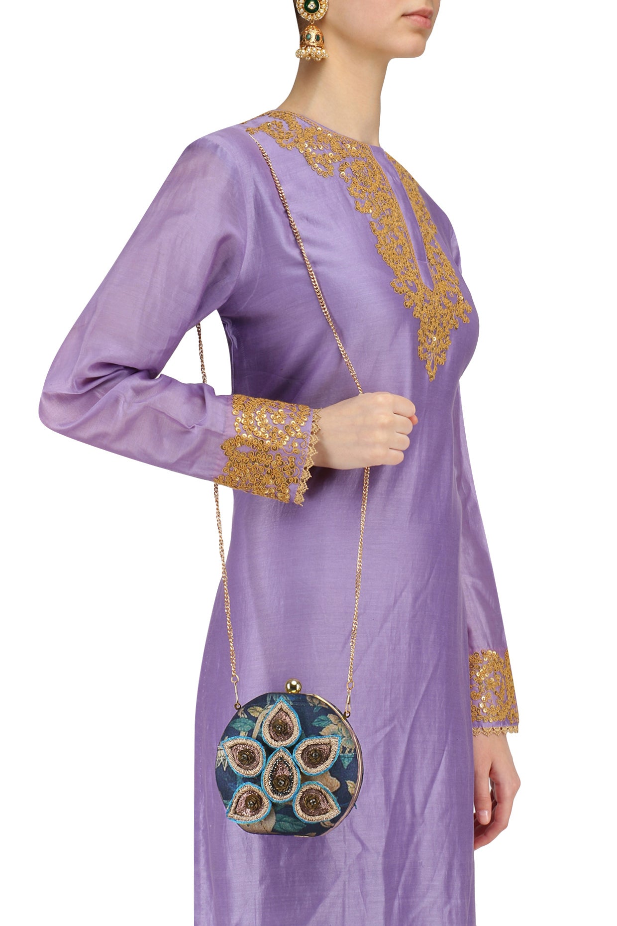 Add a dash of glamour to your outfit with this exquisite Round Printed Clutch Bag in teal, expertly crafted from silk and featuring a delicate layer of net. The bag is meticulously embellished with intricate leaf motifs, beautifully embroidered in zari, crystals, and zardozi thread, creating a truly eye-catching effect. The gold metal sling chain adds a touch of sophistication, allowing you to wear this stunning clutch with ease. Perfect for elevating any outfit, from formal events to everyday chic, this Teal Clutch Bag is sure to make a statement and leave a lasting impression.