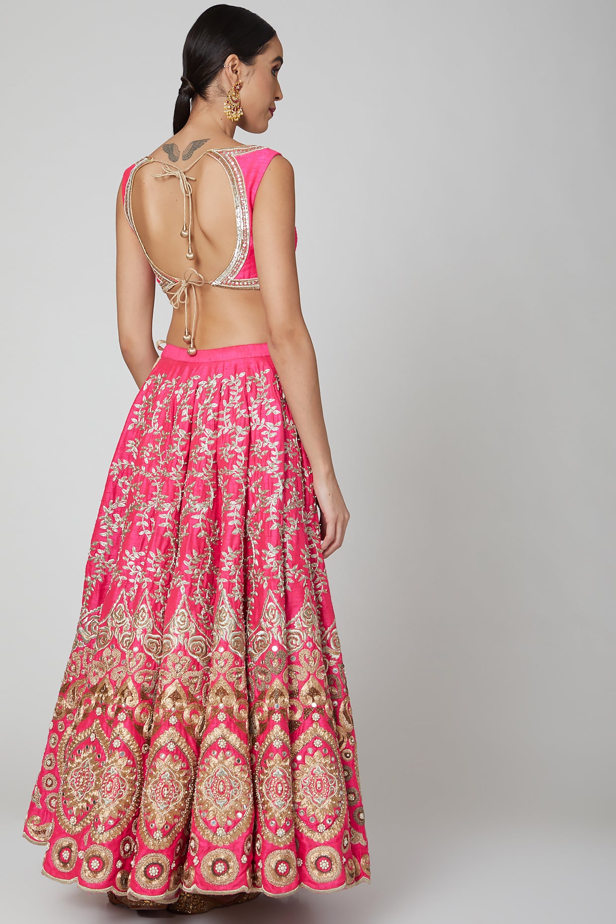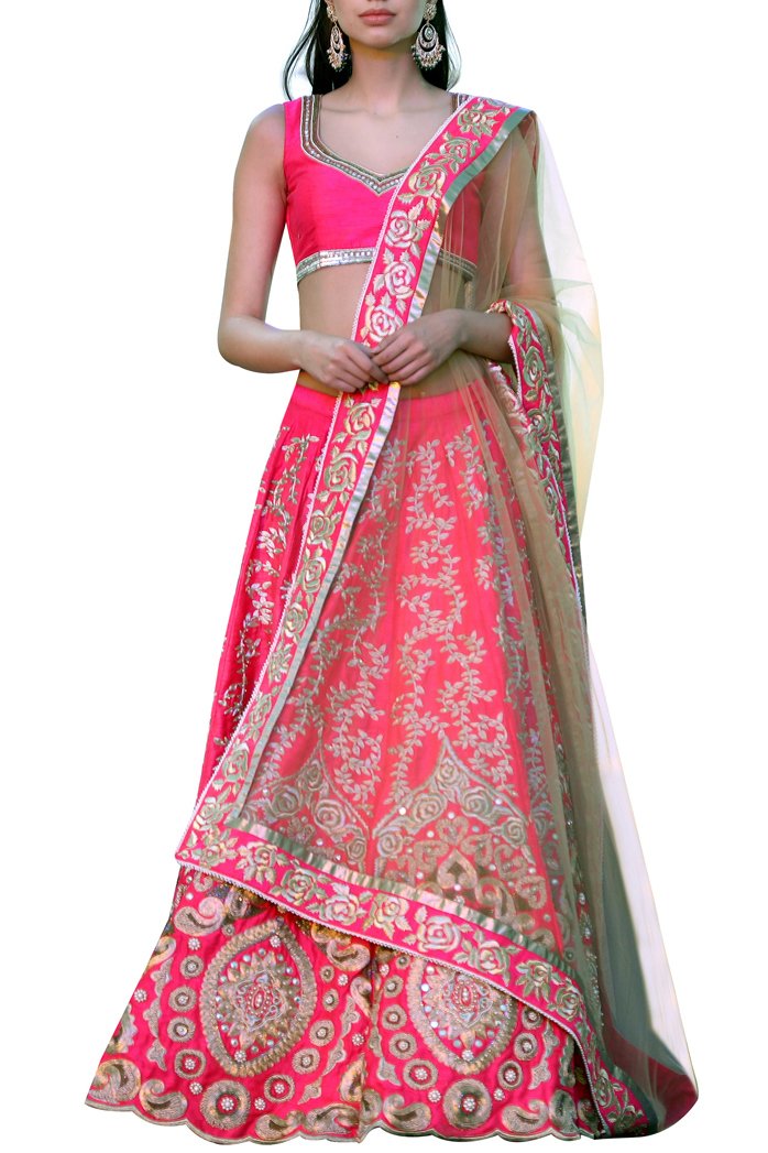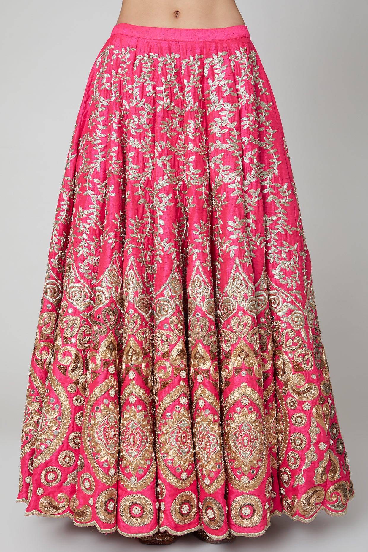 Featuring a pink lehenga in silk base with pearls and mirrors floral embroidery. It is paired with a matching blouse and a gold net dupatta.