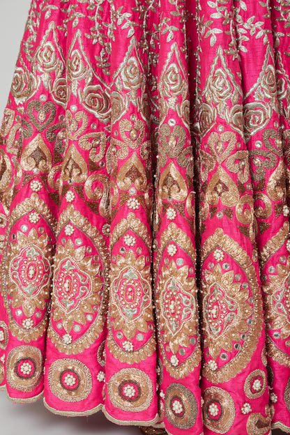 Make a regal statement in this breathtaking Bright Pink Bridal Lehenga, showcasing exquisite heavy embroidery work that combines Pearls, Zari, Mirror, Aari, and intricate Zardozi techniques. The silk lehenga's matching blouse features stunning Pearl and Zari embroidery along the wide U-neckline and hemline, adding a touch of sophistication. The ensemble is completed with a luxurious Gold Net Dupatta, adorned with an embroidered rose border on all sides, creating a truly majestic look. Perfect for the bride who desires a show-stopping, one-of-a-kind appearance on her special day.