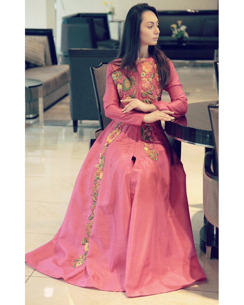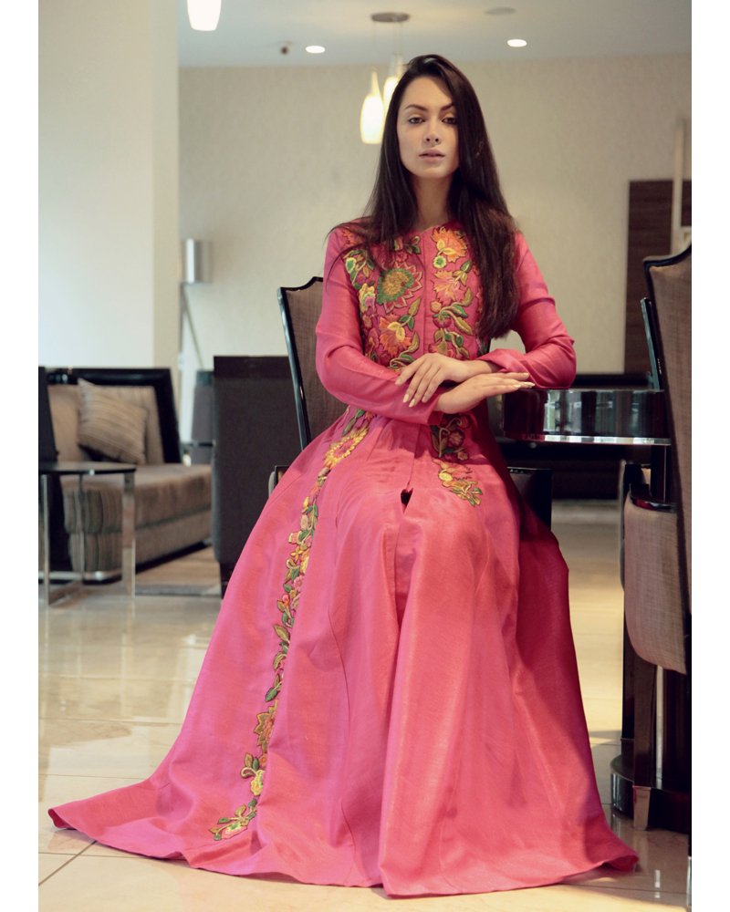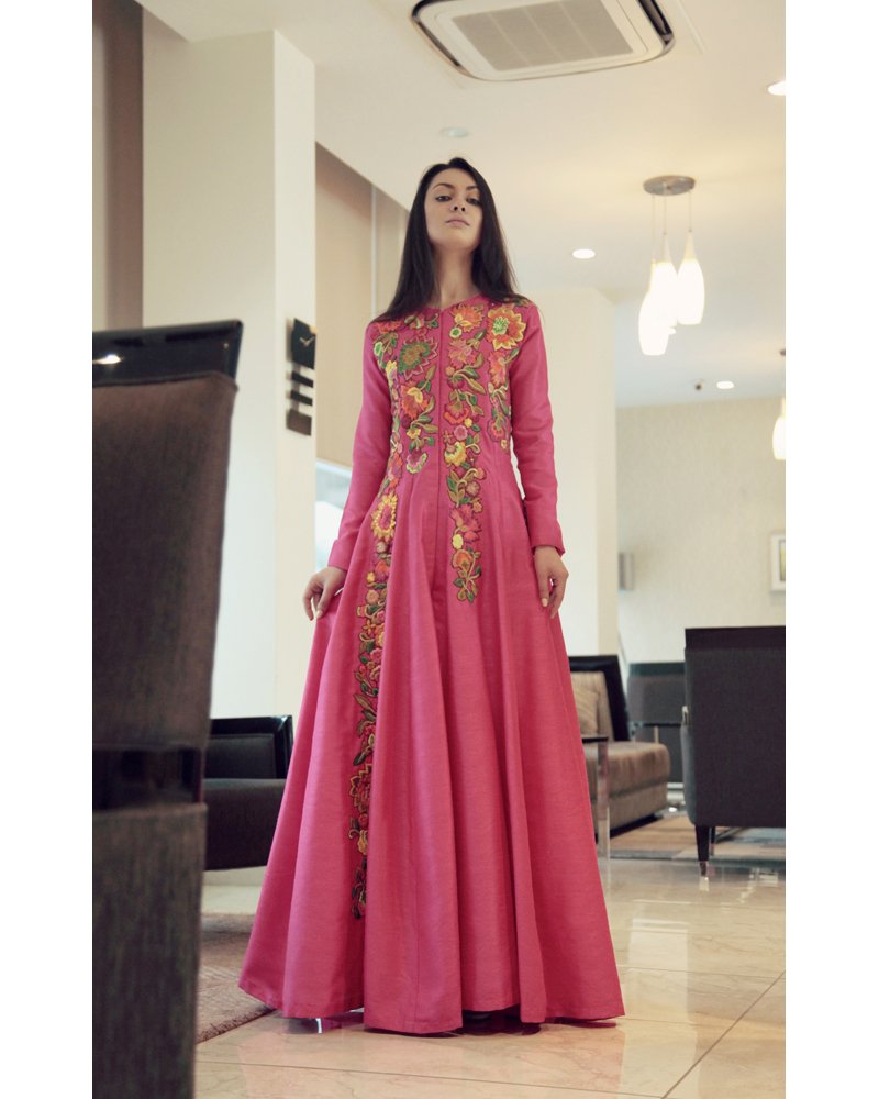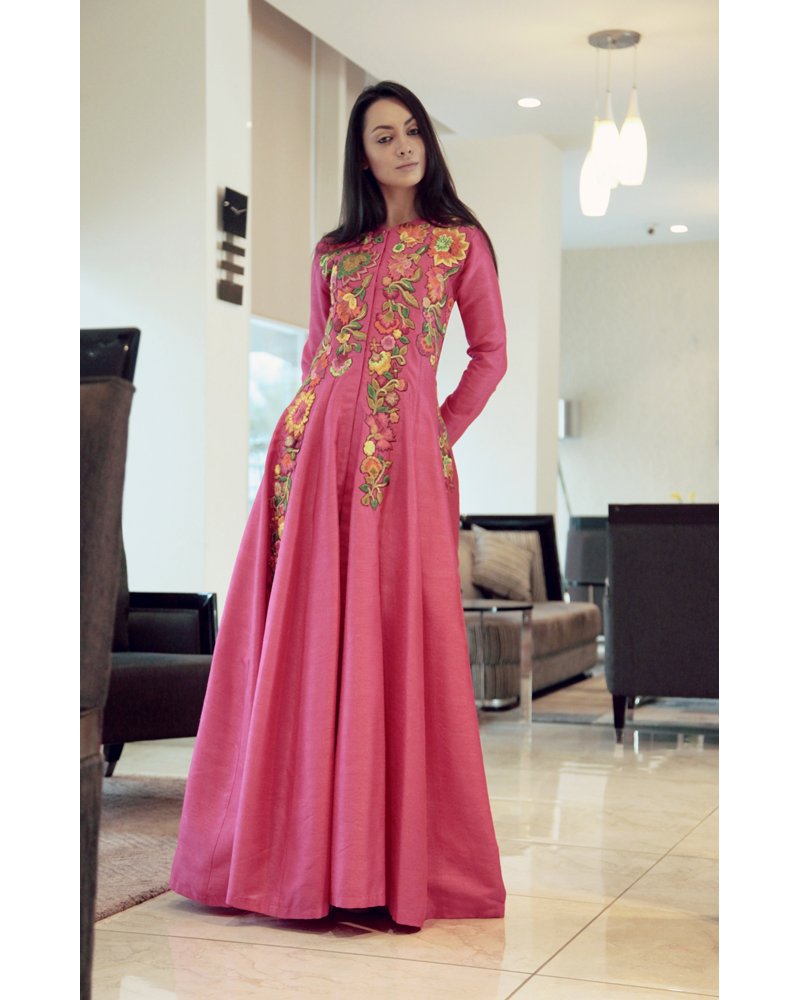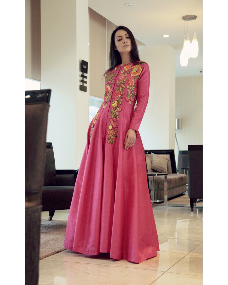 Featuring a fuchsia front open flared jacket kurta in silk blend base with floral multi-coloured embroidery. It is paired with matching pants.