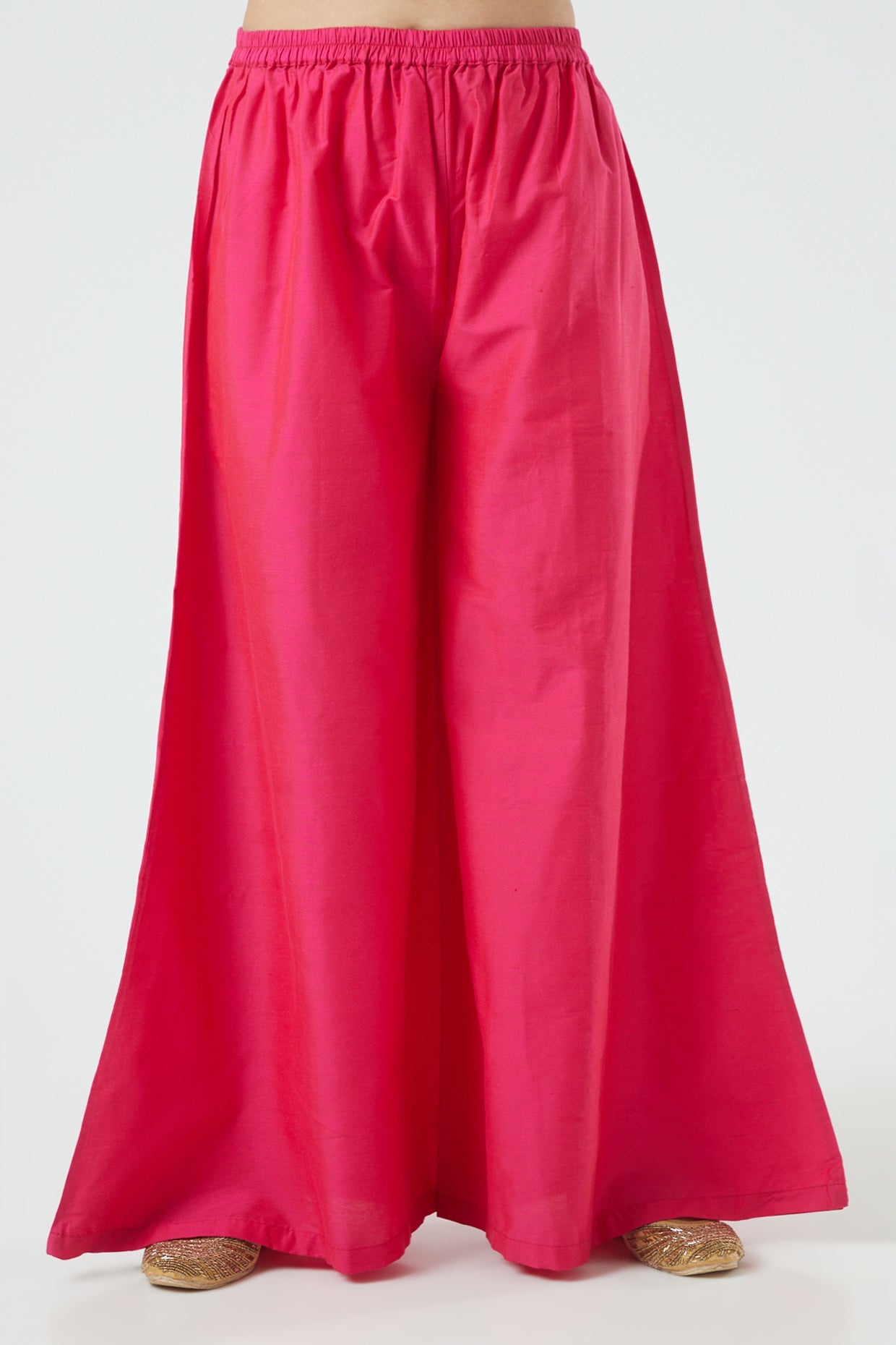 Add a touch of elegance to your wardrobe with this beautiful Pink Floral Embroidered Jacket Set. The silk jacket features a well-fitted bust and waist, with a flattering ankle-length design and dramatic flares from the waist. The intricate floral embroidery adds a delicate touch, making this set perfect for formal events, parties, or special occasions. Paired with comfortable cotton silk palazzo pants, this set is a stunning combination of style and comfort.