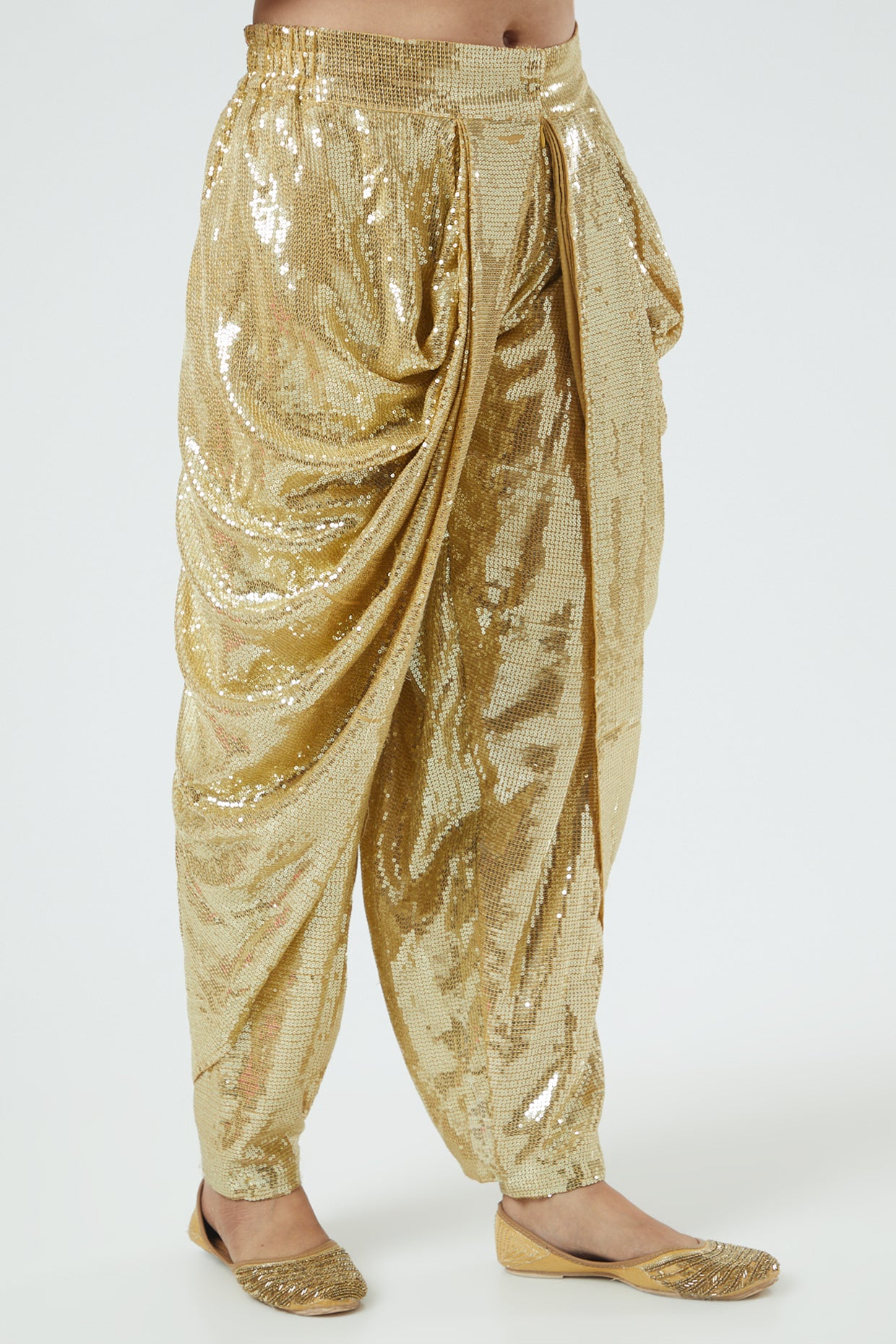 Featuring a fuchsia short flared kurta in silk blend base with gota patti and pearl embroidery. It is paired with contrasting gold sequinned dhoti pants.