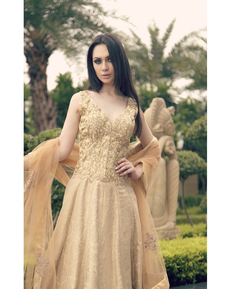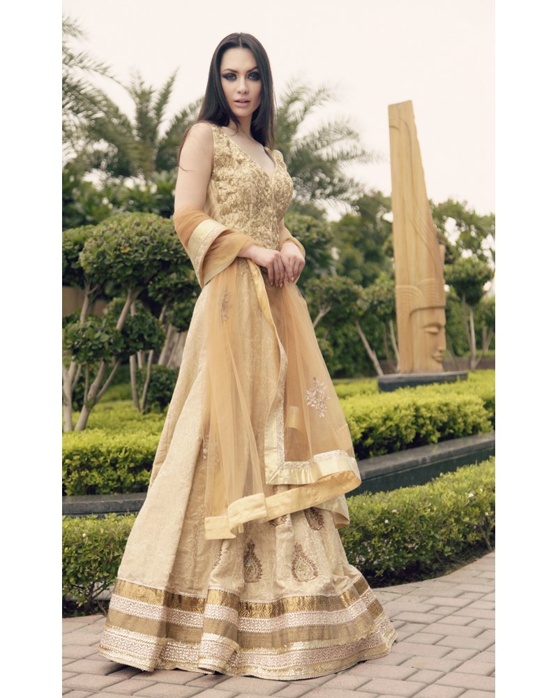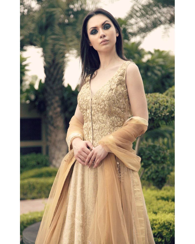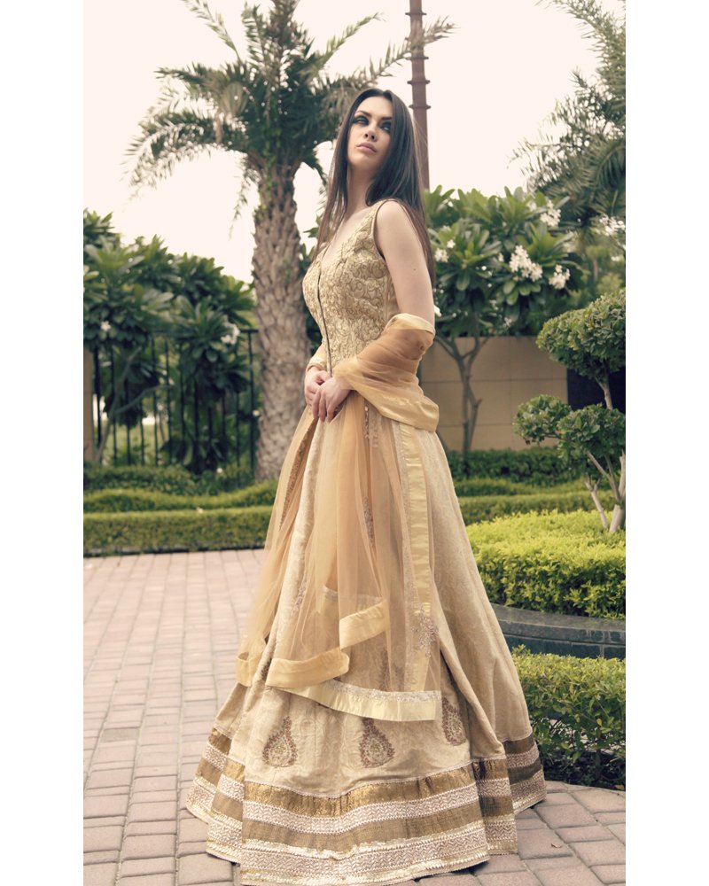 Featuring a gold flared anarkali in silk base with heavy gold embroidery on bodice and embroidered leaf motifs on ghera along with gold border on the hem. It is paired with gold net dupatta with embroidered motifs all over.
